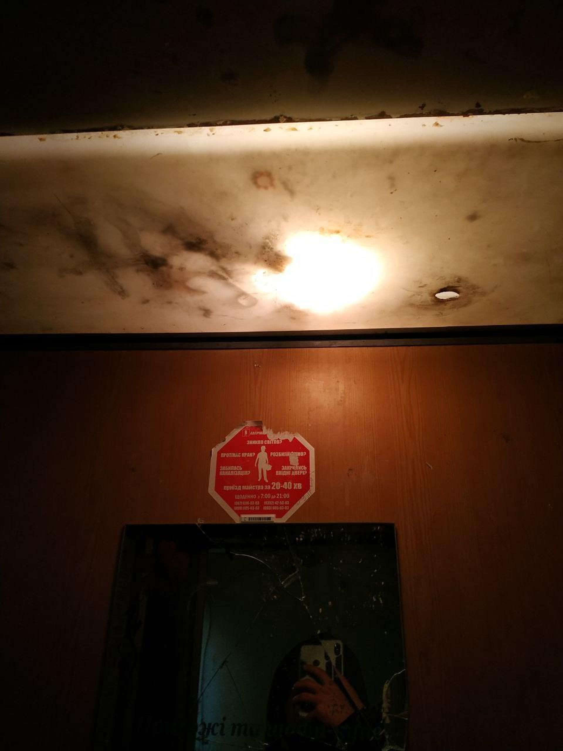 Всередині картина не ліпша. Тут ми зустрічаємо самих себе, а вірніше, наше відображення, адже одразу навпроти дверей розмістили дзеркало, що вже розбили. Освітлення бажає бути кращим, адже піднявши голову вверх, помічаємо пропалений захист ламп, що мав би ліпше розсіювати саме світло, але тільки не через задимленість. Стеля також не в ліпшому стані, починає лущитися.