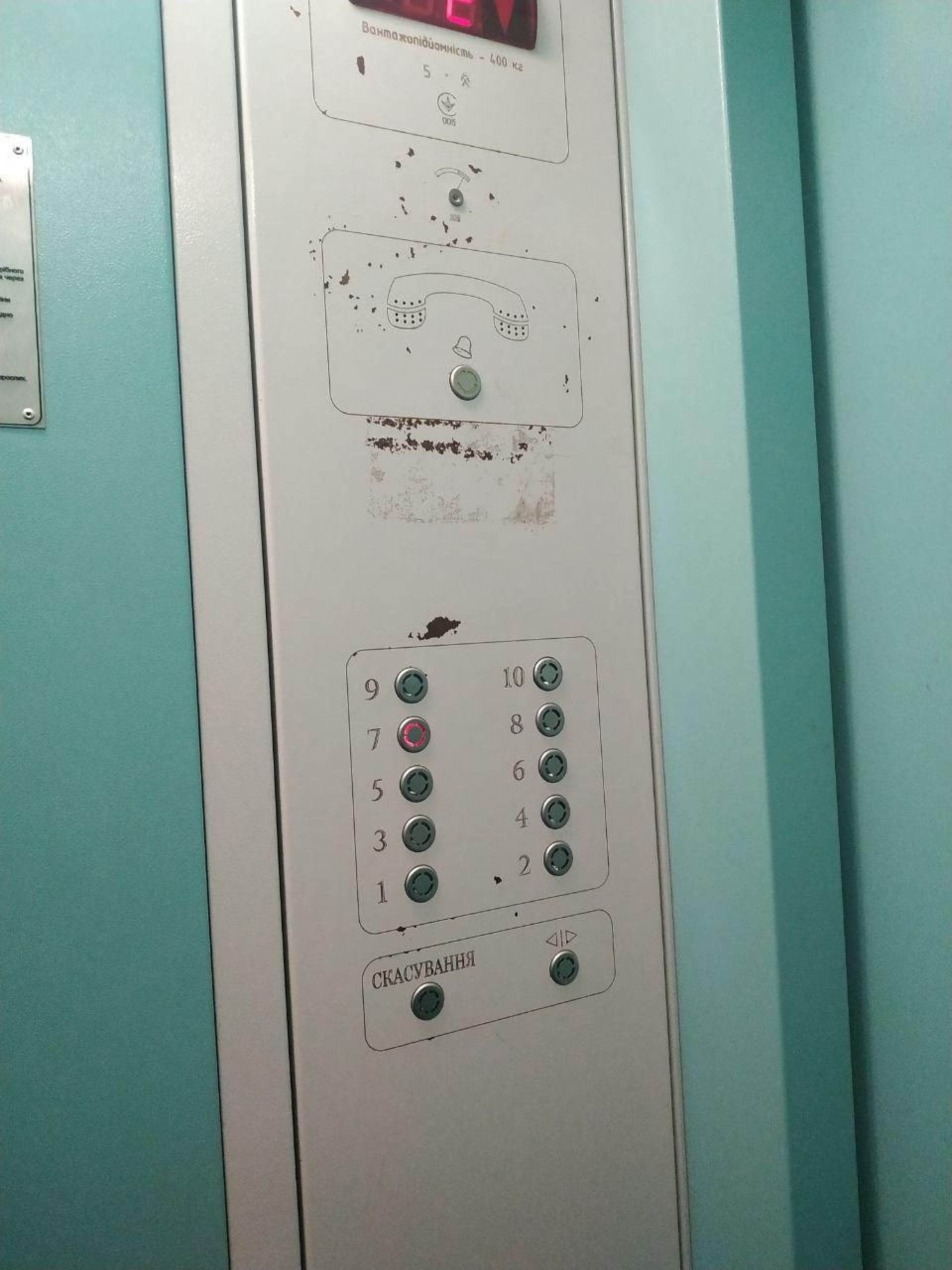 Кнопки ліфта металеві, а отже, більш захищені від вандалів, які часто підпалюють пластмасові. Від часу, а можливо, ще з якихось причин, оригінальні цифри біля кнопок вже стерлися і маркером написали нові.