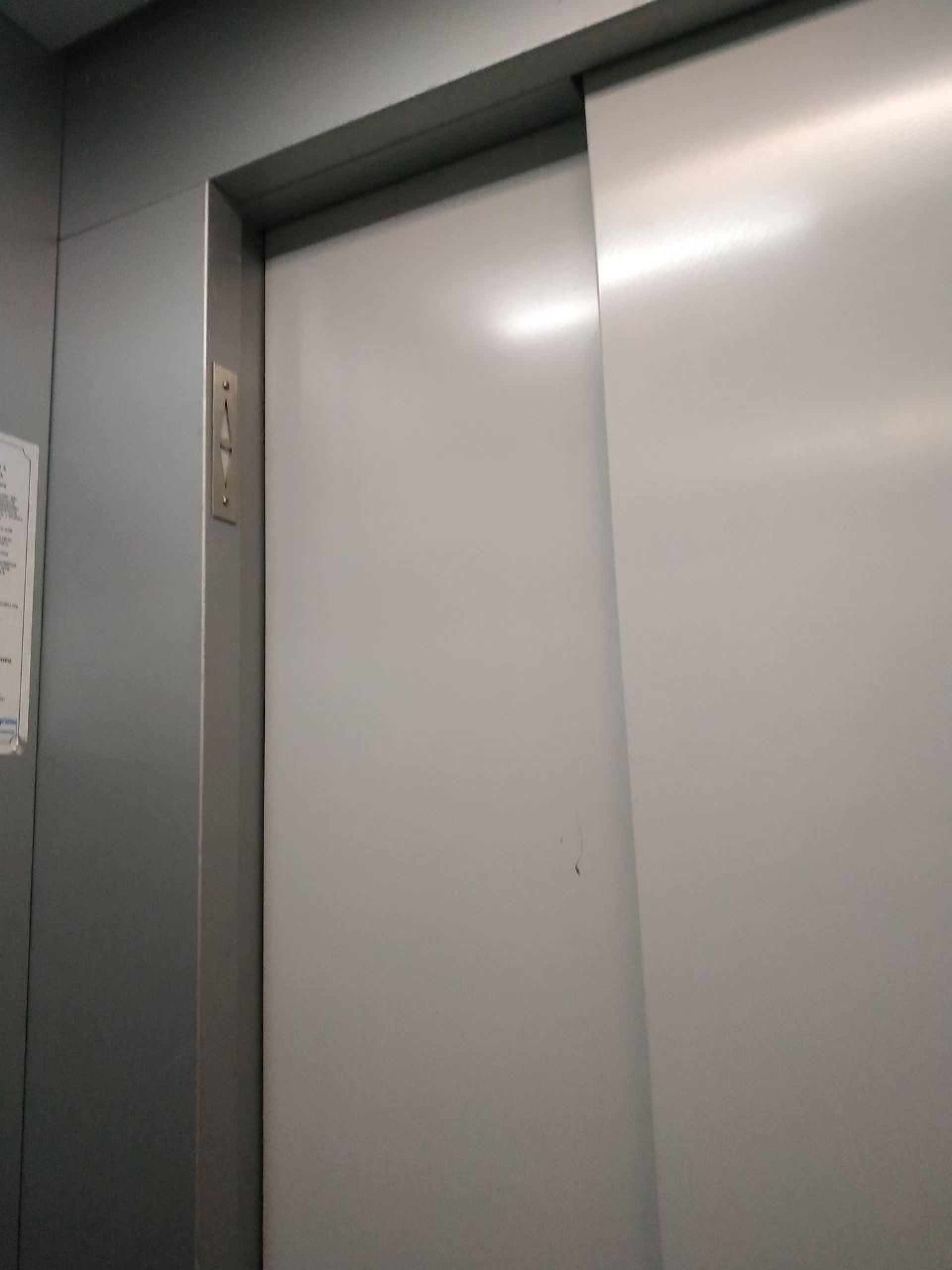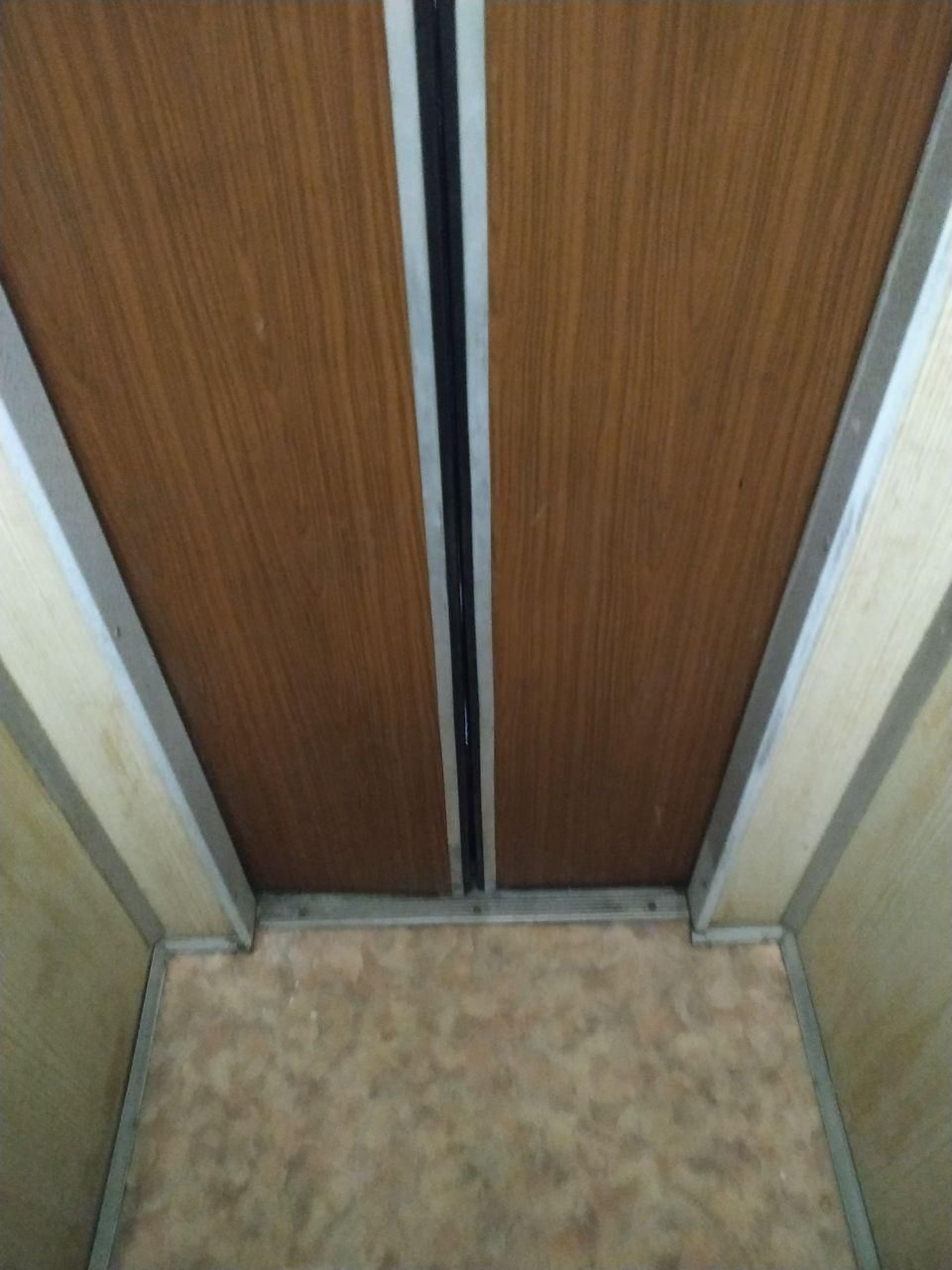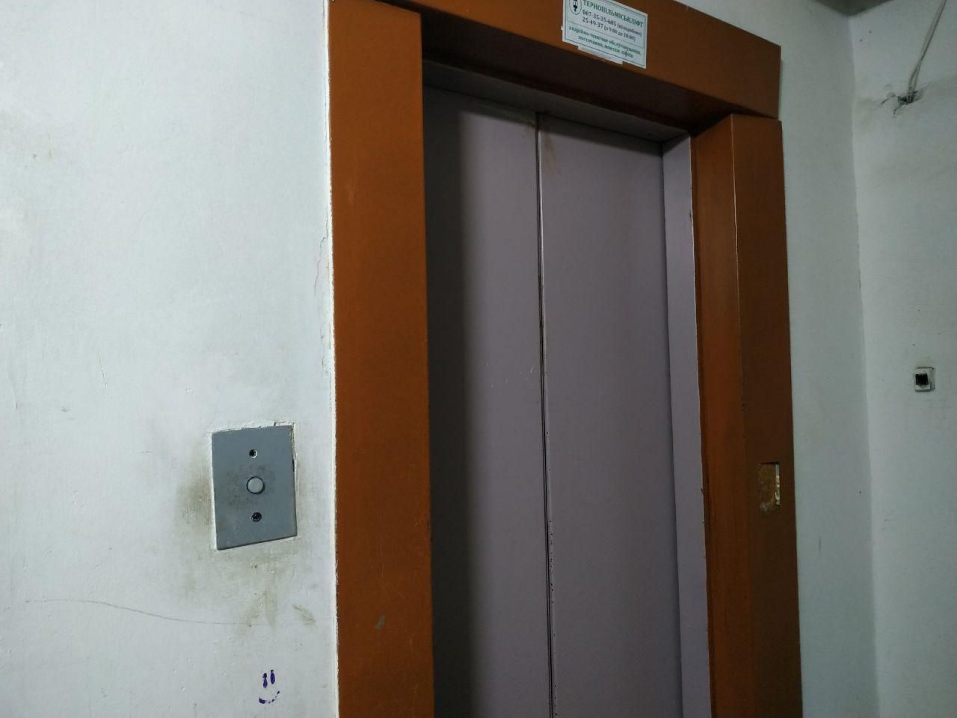 Ззовні двері ліфта виглядають щонайменше зношеними від постійних відкривань та закривань, а фарба на наличниках обдирається.