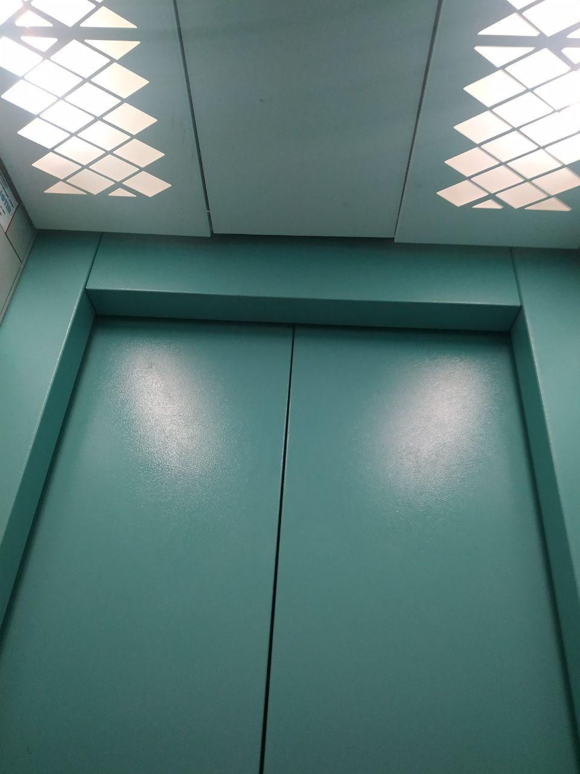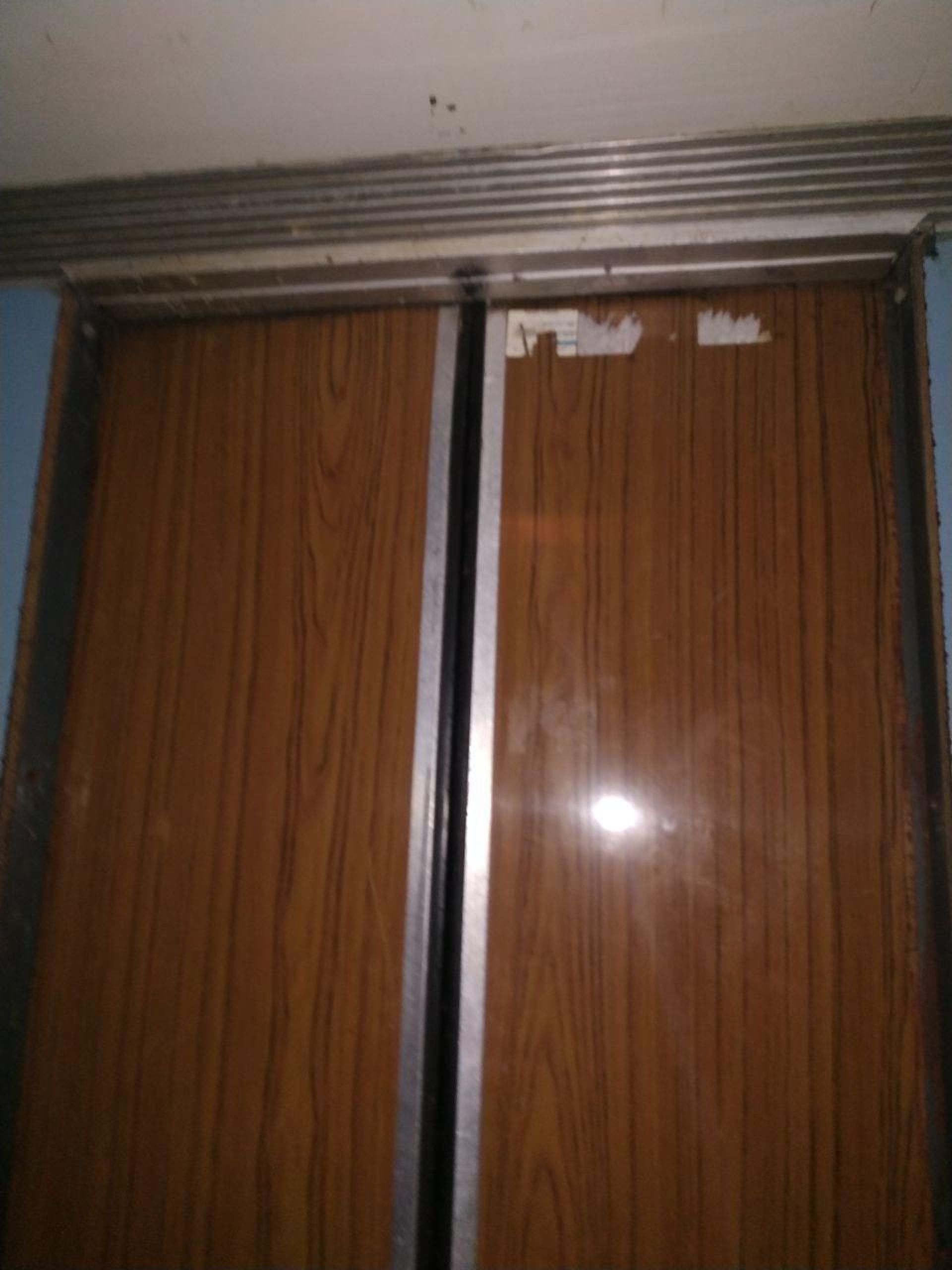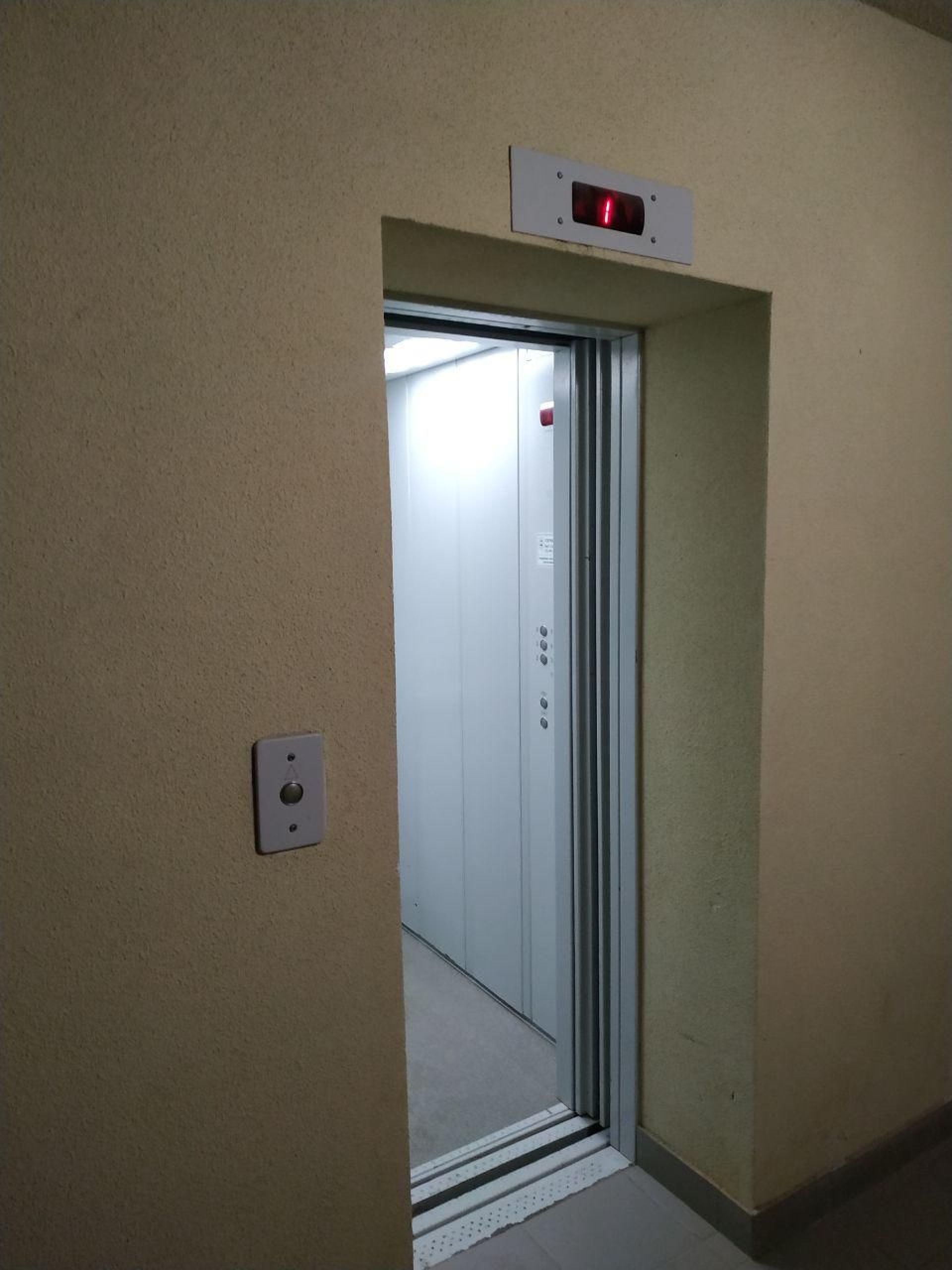 Ззовні двері ліфта виглядають щонайменше зношеними від постійних відкривань та закривань, а фарба на наличниках обдирається.