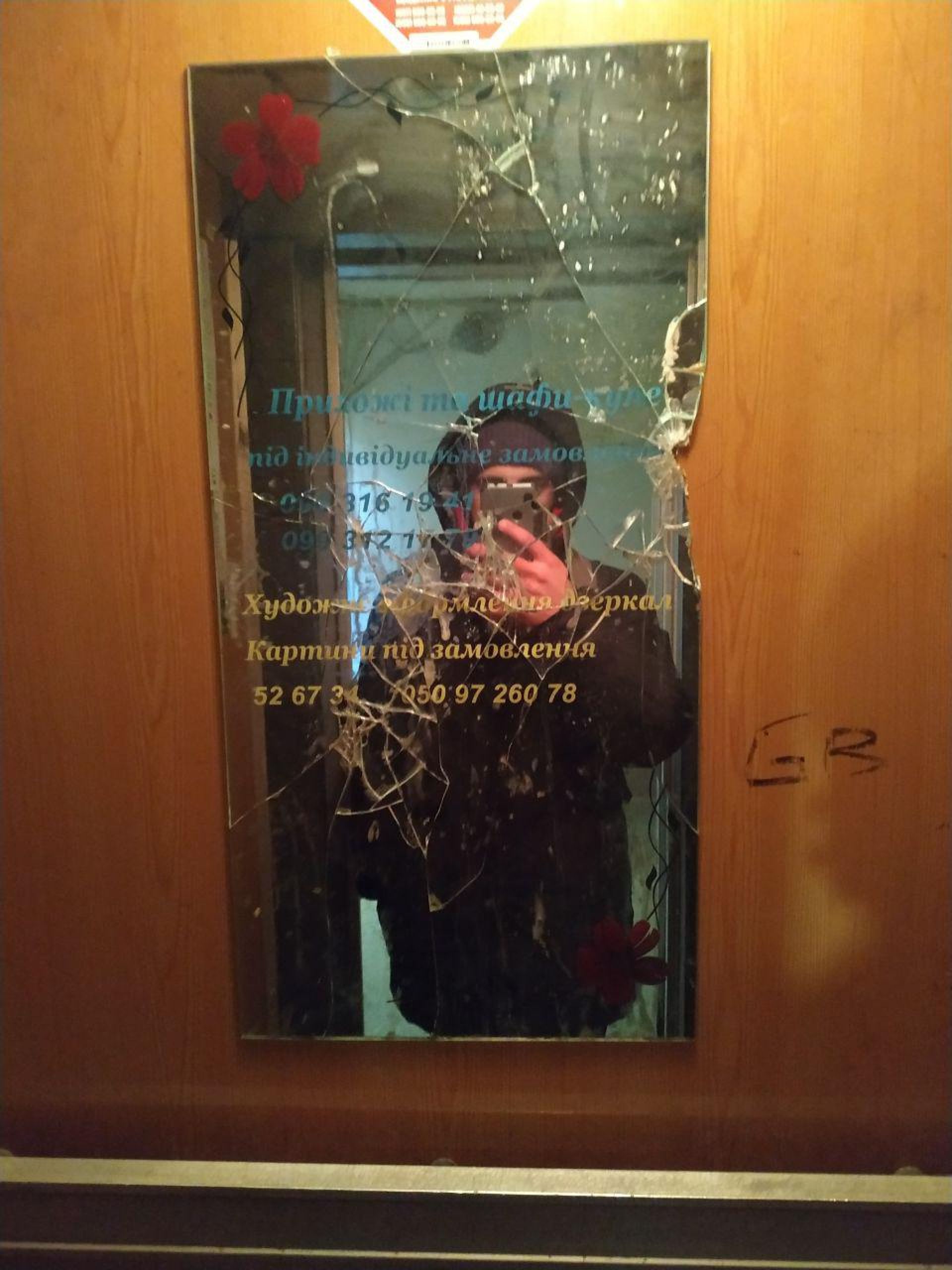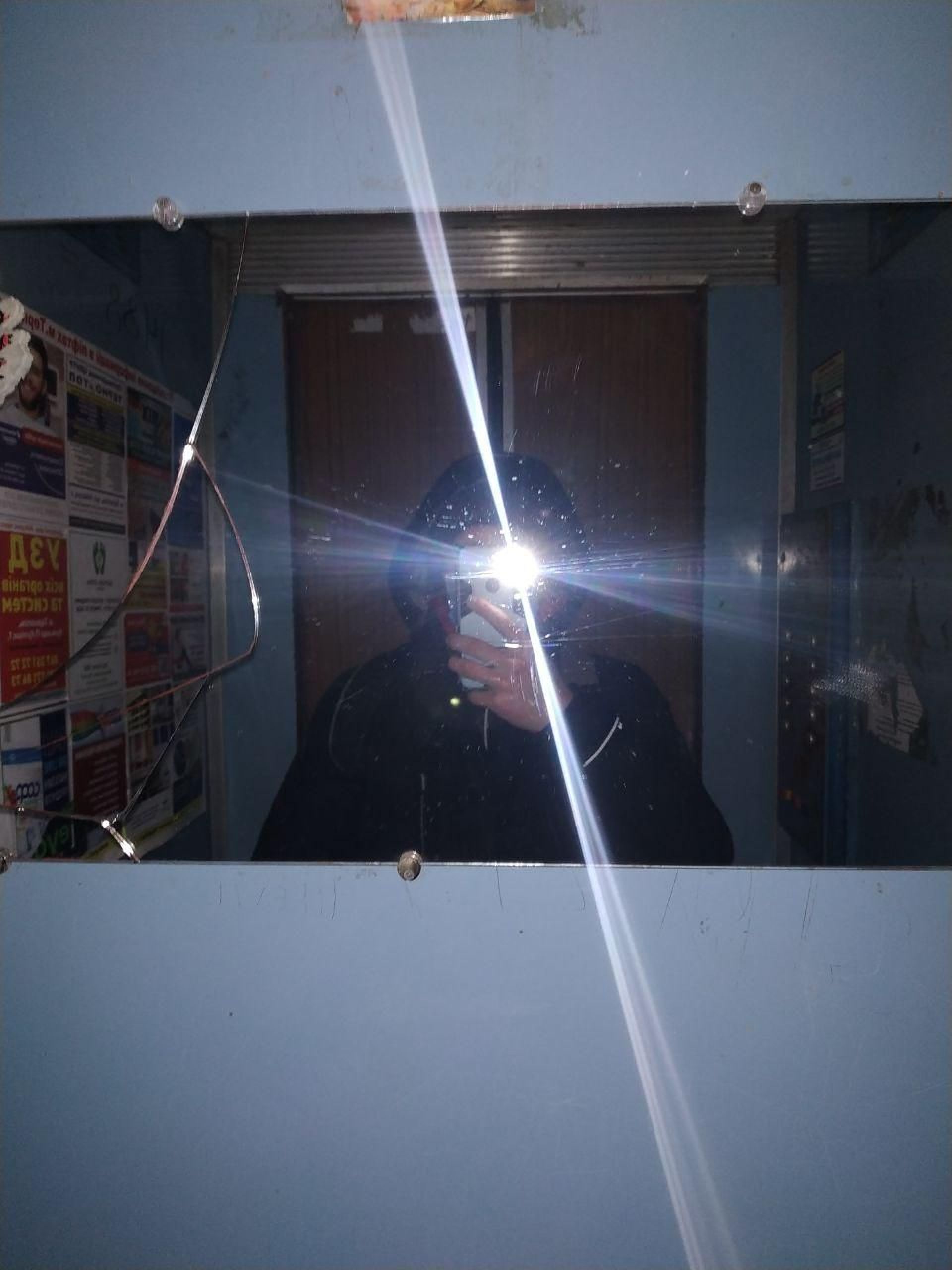 Всередині є дзеркало, щоправда, розбите. В ліфті темно, попри світлі стіни, тому ми ввімкнули ліхтарик на телефоні.