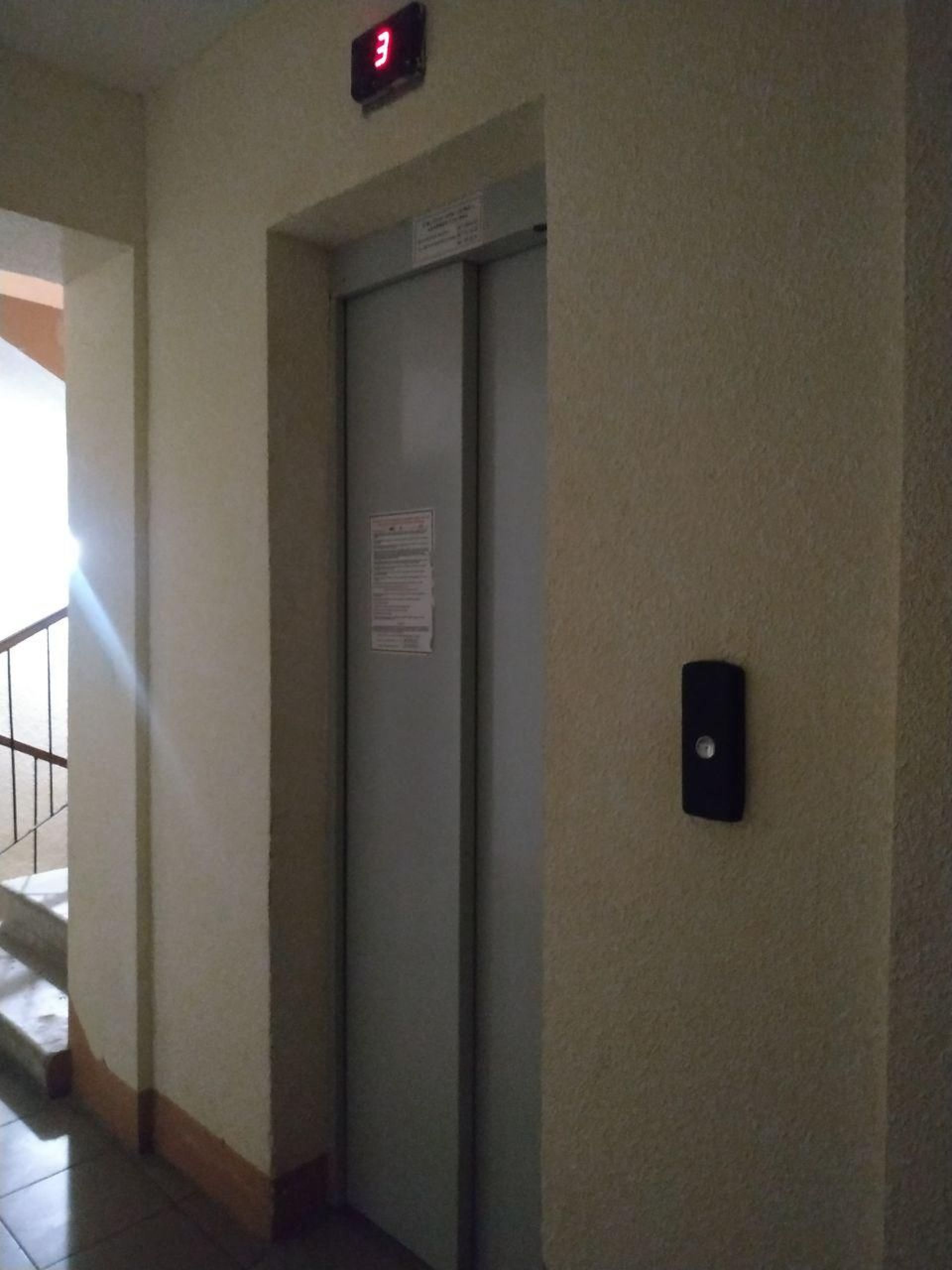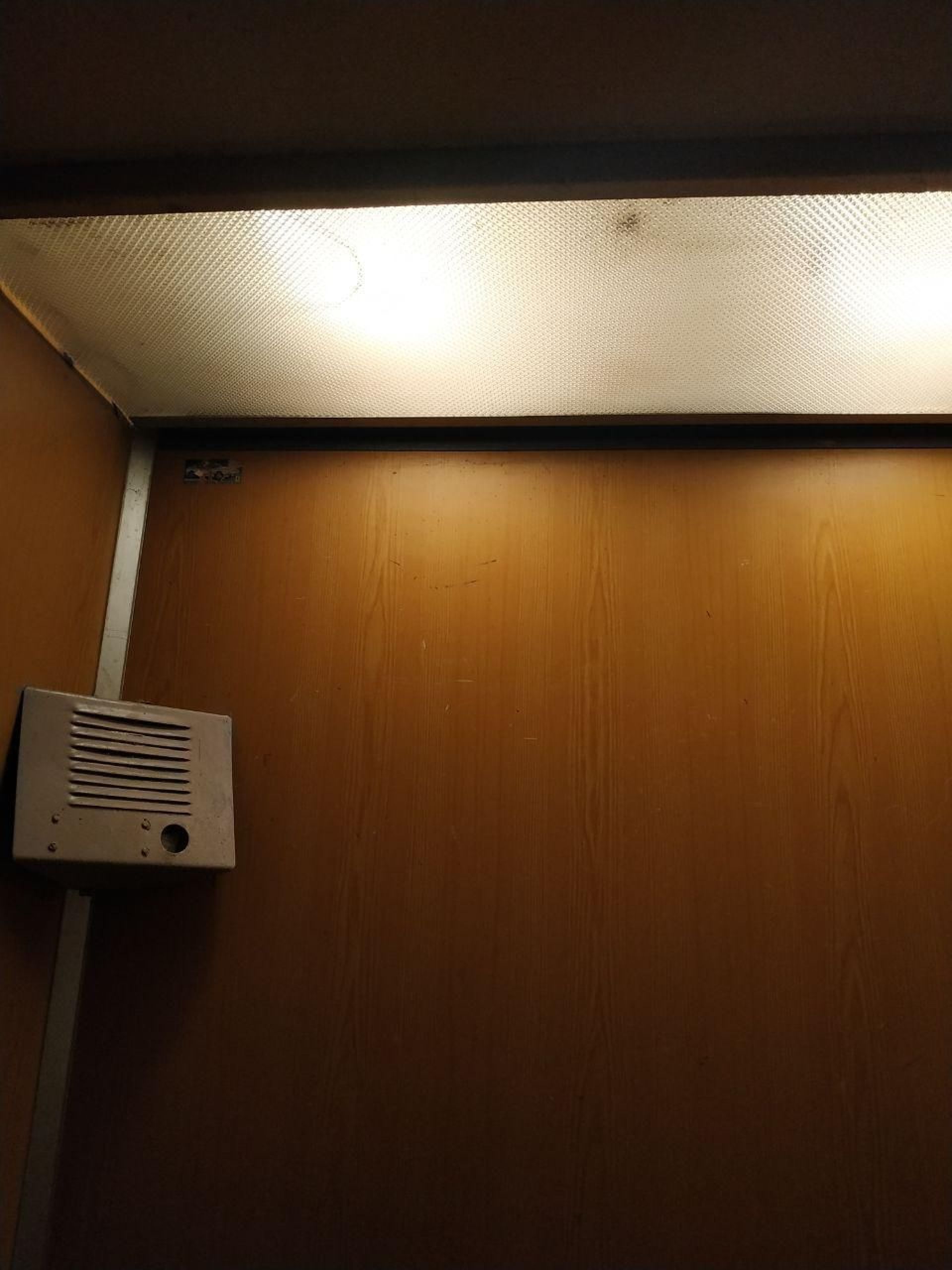 Його дерев’яне облицювання вже не раз перефарбовували, це помітно за товстим, але відносно шаром фарби. Біля кнопки виклику ліфту брудно від постійних натискань на неї мешканцями будинку.