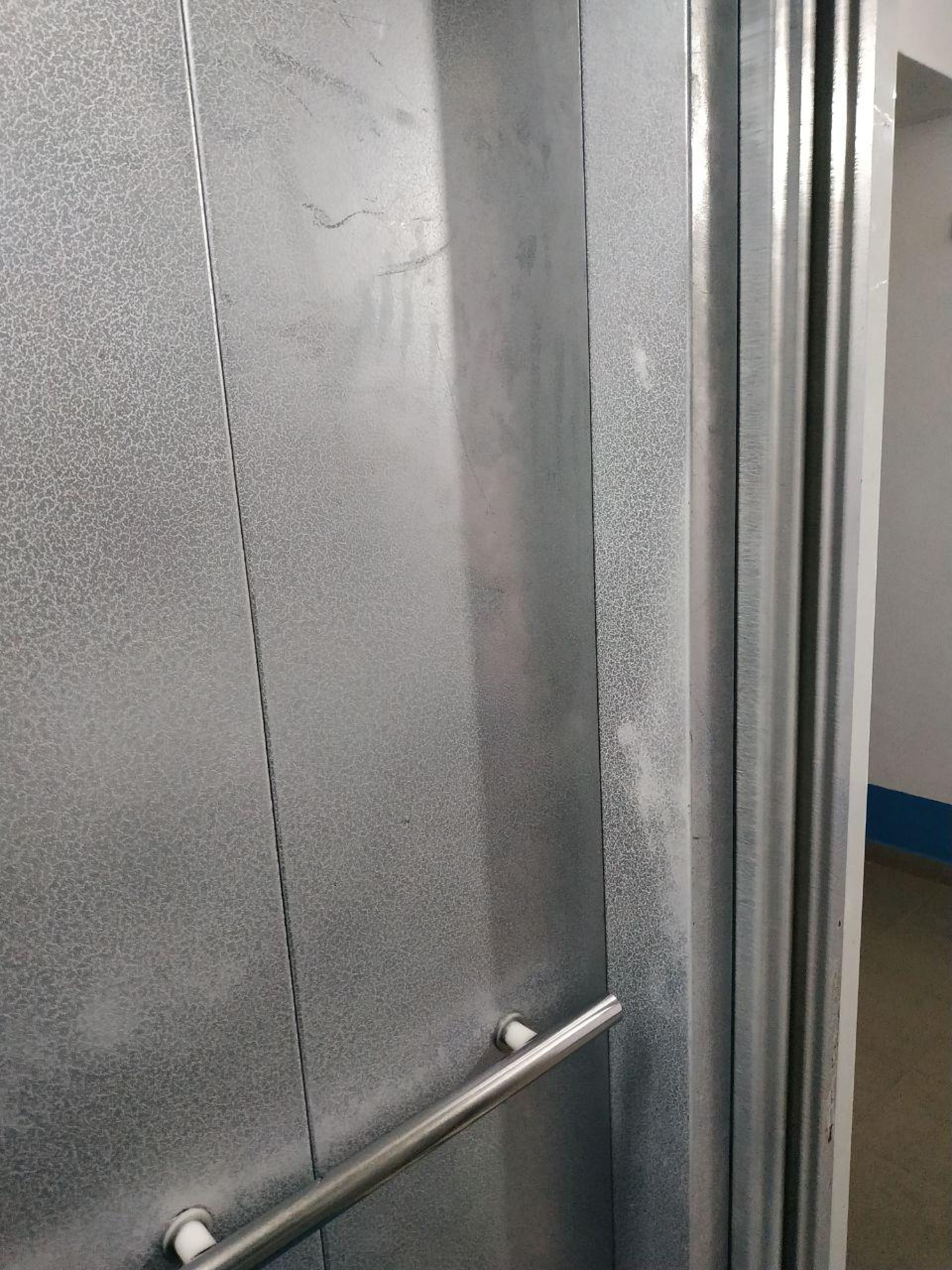 Всередині ліфта більш видно його потертість, а фарба на дверях вже потрохи лущиться, знизу він починає ржавіти.