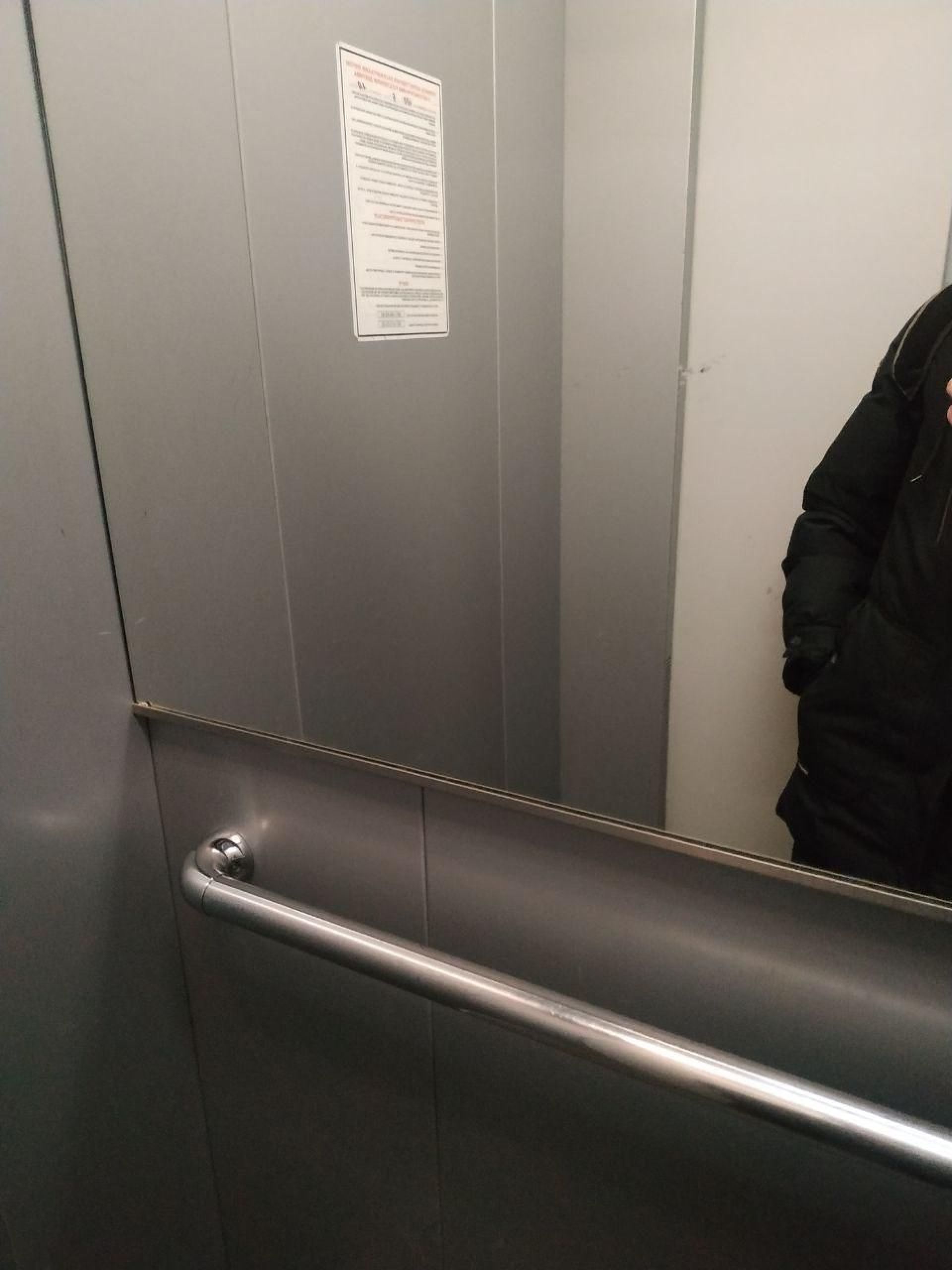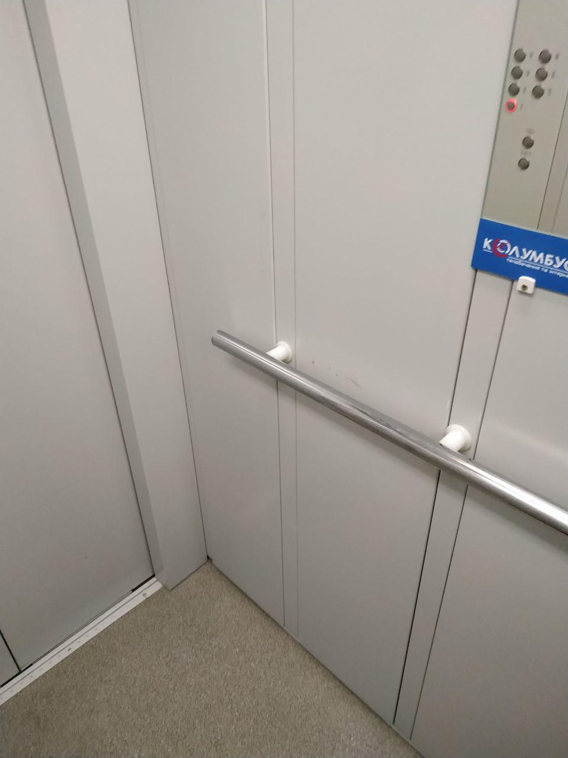 Всередині він обладнаний поручнями, просторий та чистий. На відміну від попередніх, цей ліфт оббитий металевими листами.