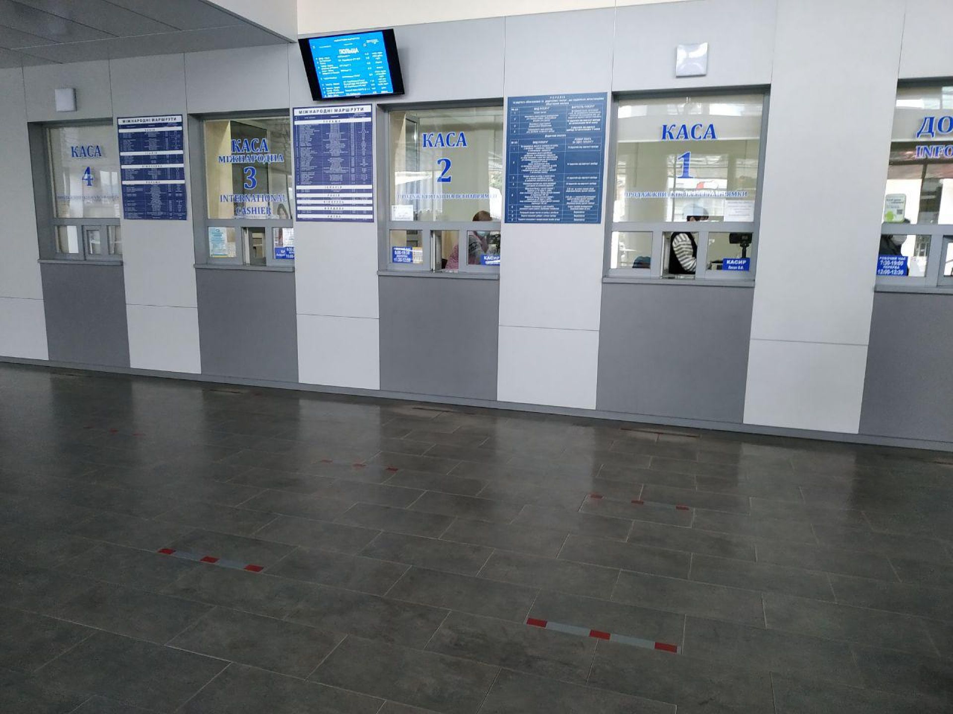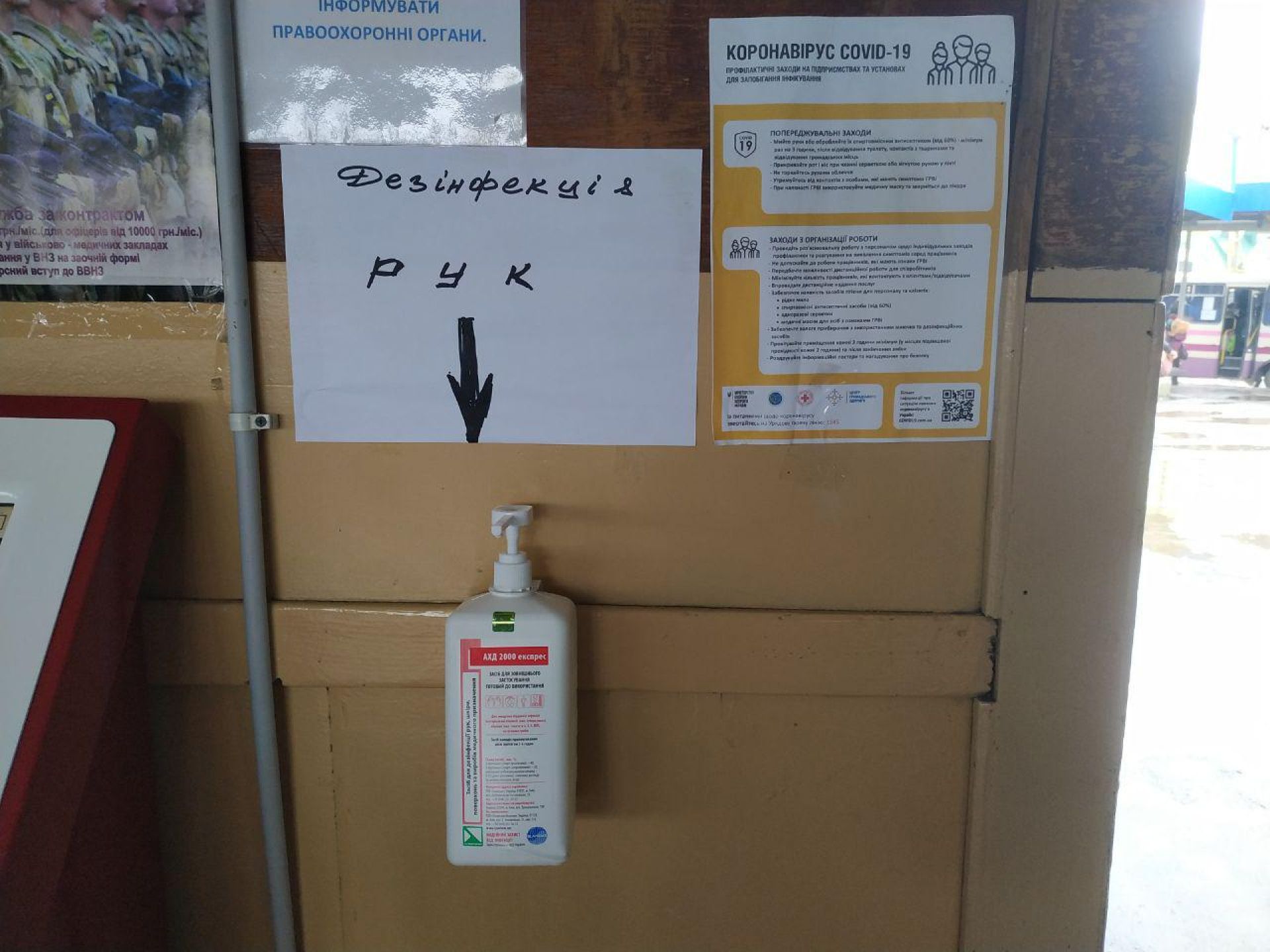 Працівники автовокзалу працюють в масках, є засіб для дезінфекції рук. Перед касами є стрічки для дотримання дистанції між людьми.