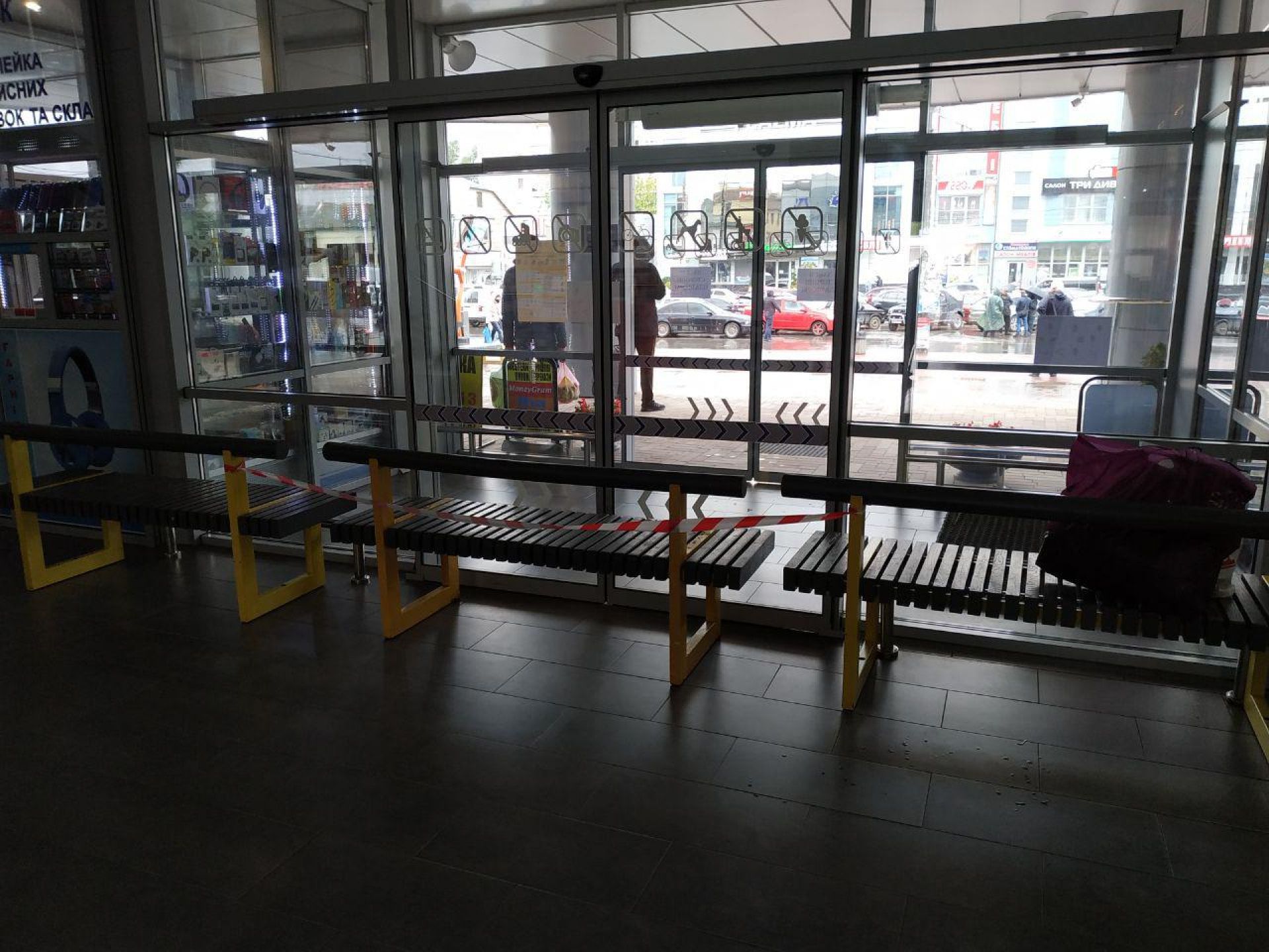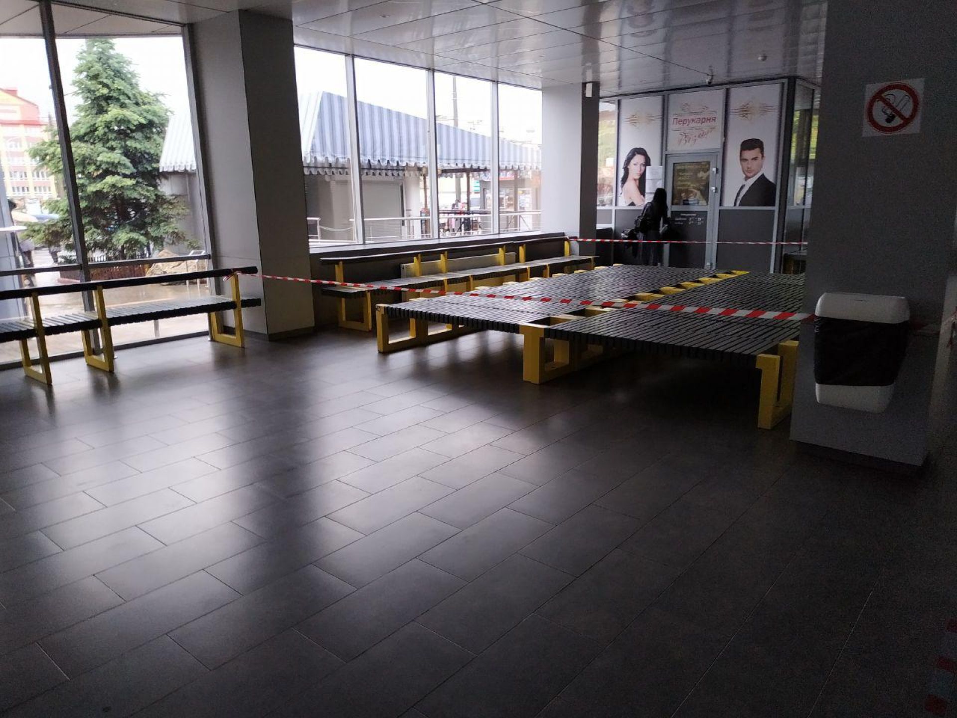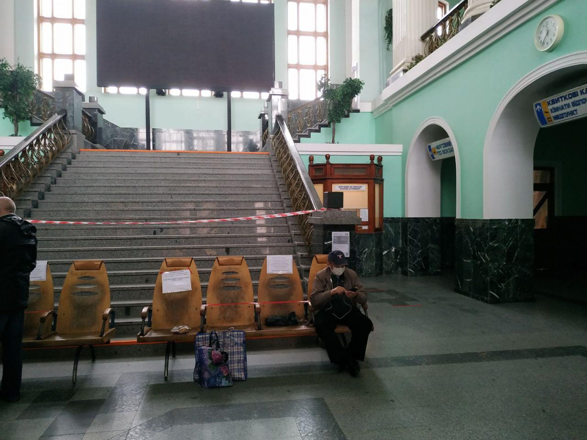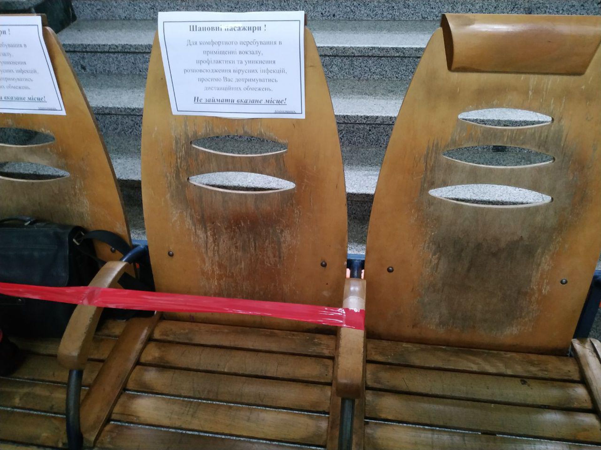 Почекати потяг чи електричку на другому поверсі приміщення залізничного вокзалу поки не можна. Вхід до нього загороджений лавкою та обмежувальною стрічкою. Людей закликають дотримуватися соціальної дистанції. Два місця з чотирьох обмежили стрічками.