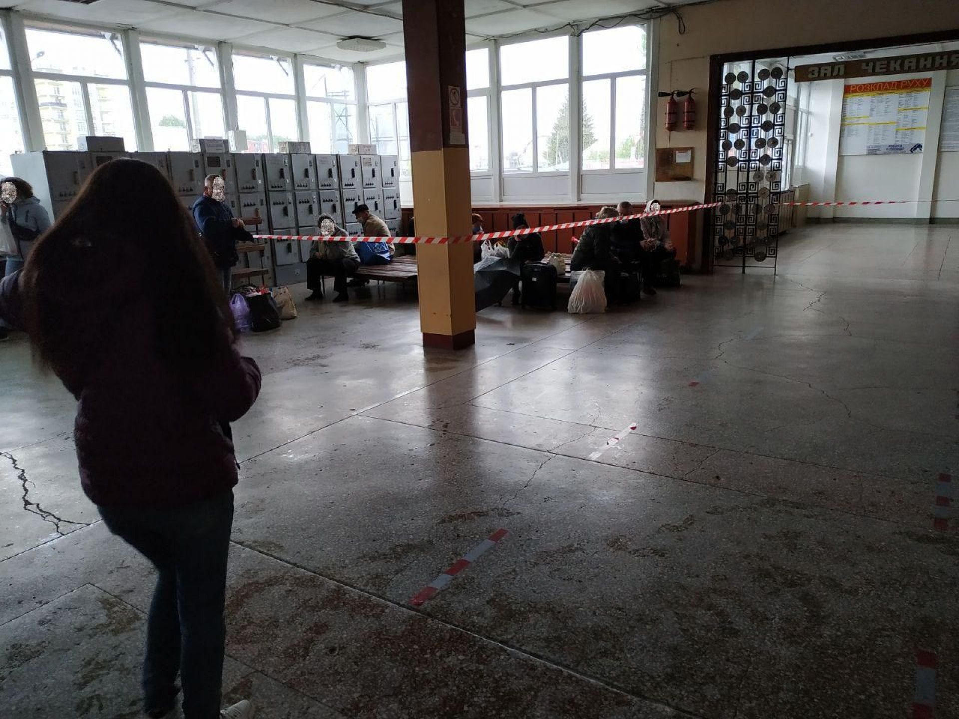 Перед входом до приміського вокзалу також міряють температуру. Охочих почекати всередині приміщення приміського вокзалу доволі багато, а деякі навіть не зважають на обмежувальну стрічку. Зал очікування поки залишається закритим.
