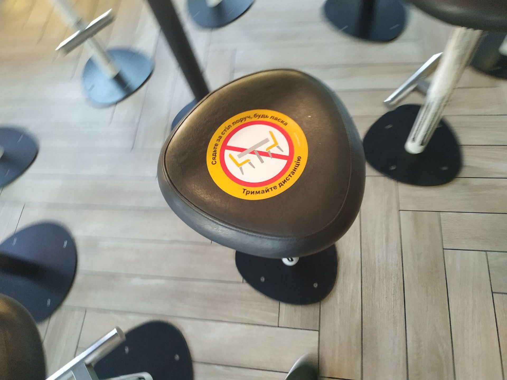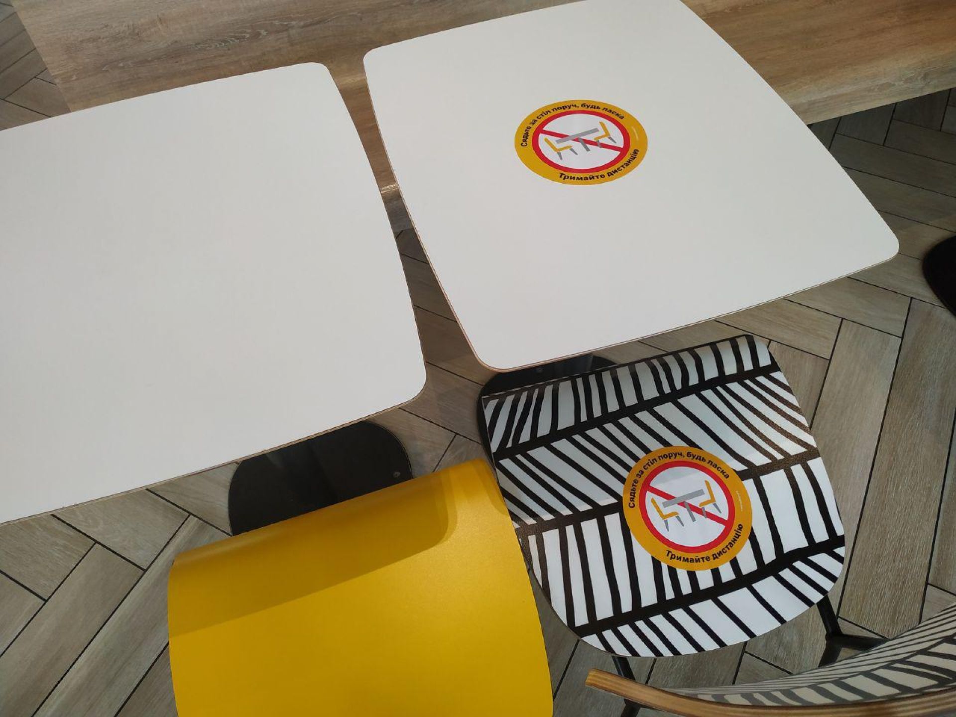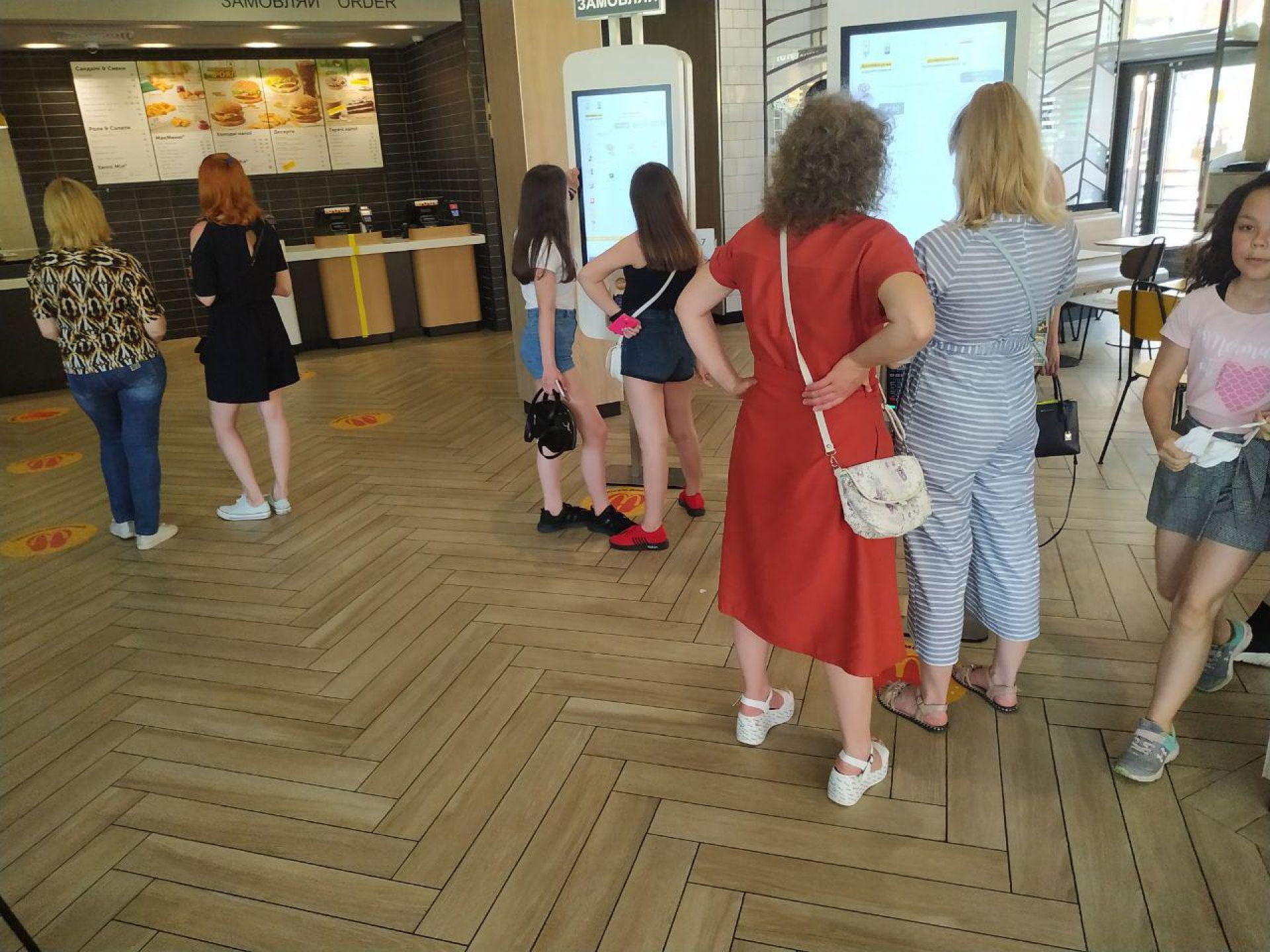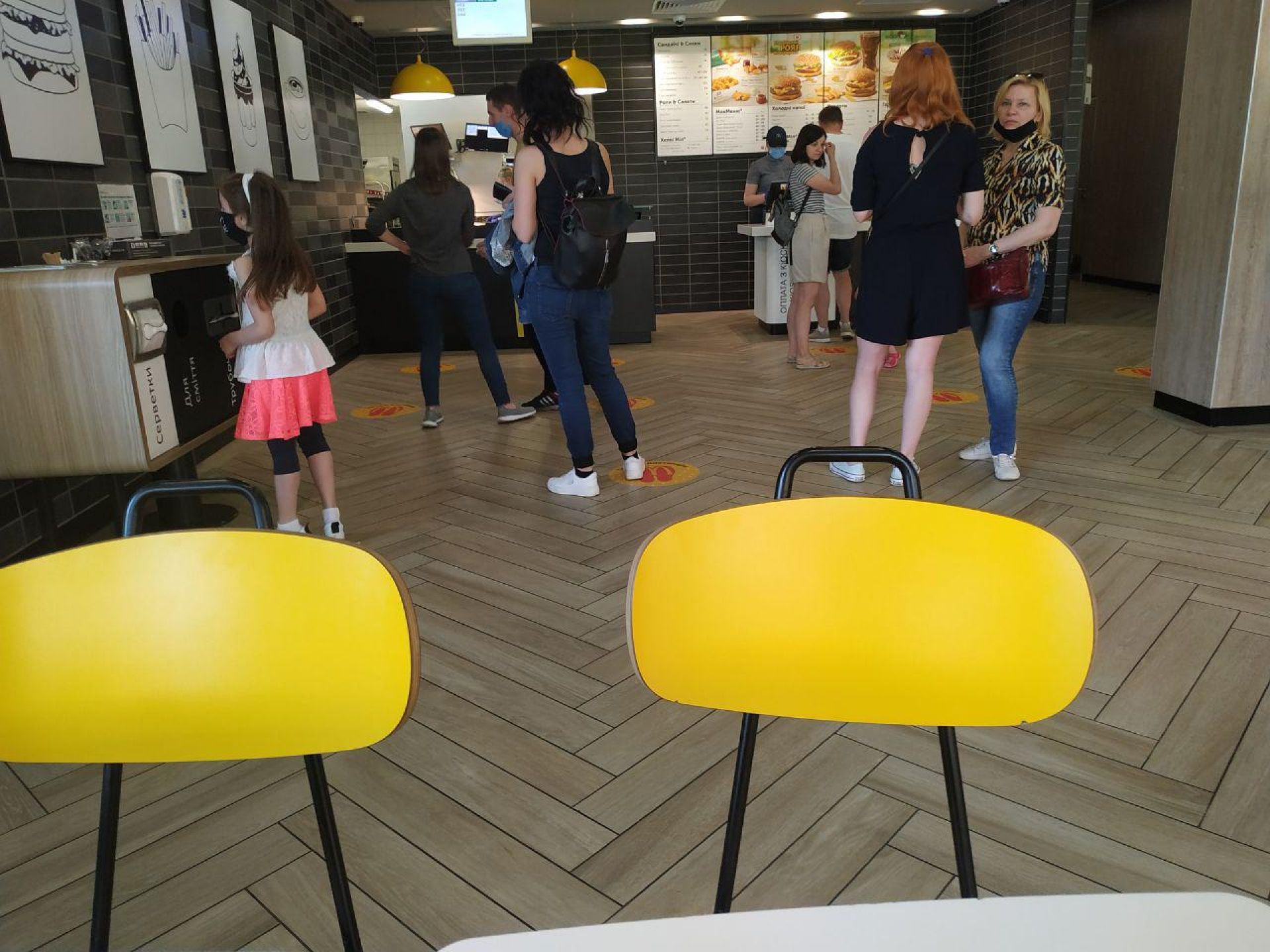 У приміщенні закладу відвідувачів доволі багато. Для того, щоб вони тримали дистанцію, на підлозі встановили розмітку. Деякі столики в «МакДональдз» відмічені, на них сідати не можна. Зробили це для того, аби була допустима дистанція між відвідувачами.