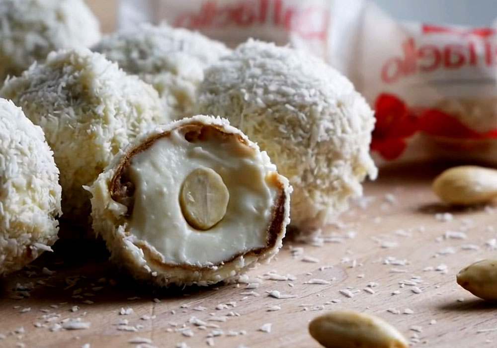 Згущене молоко змішати з м'яким вершковим маслом кімнатної температури. За бажанням влити трохи коньяку для вишуканого аромату. Додати звичайний і ванільний цукор. Залишити в холодному місці масу на день. Потім з загуслої маси сформувати кульки і вкласти всередину цукерок мигдаль. Щедро обваляти цукерки в кокосовій стружці.