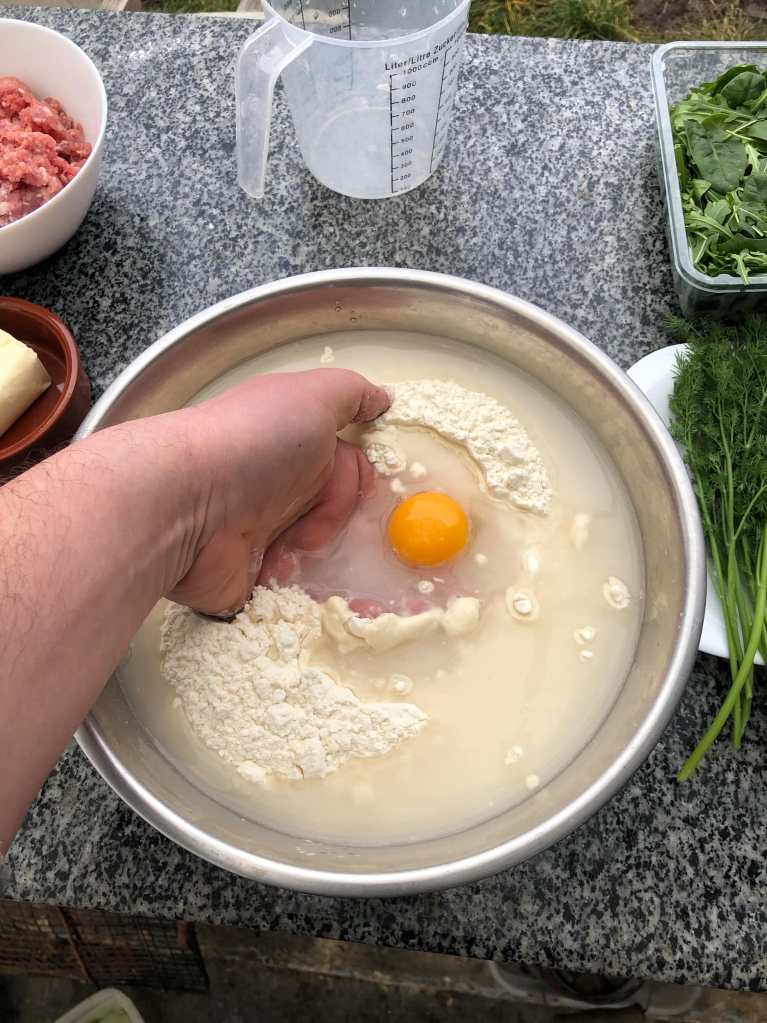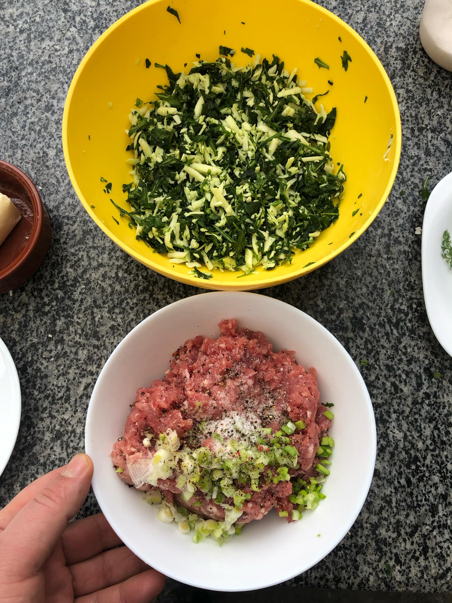 З начинками просто. Перша – фарш з телятини, цибуля, сіль та спеції. Друга – натертий сир, не дрібно порізана зелень та спеції. Важливо аби начинки не були надто жирними чи з зайвою вологою. Бо ж може витікати при смаженні, а нам потрібна суха пательня