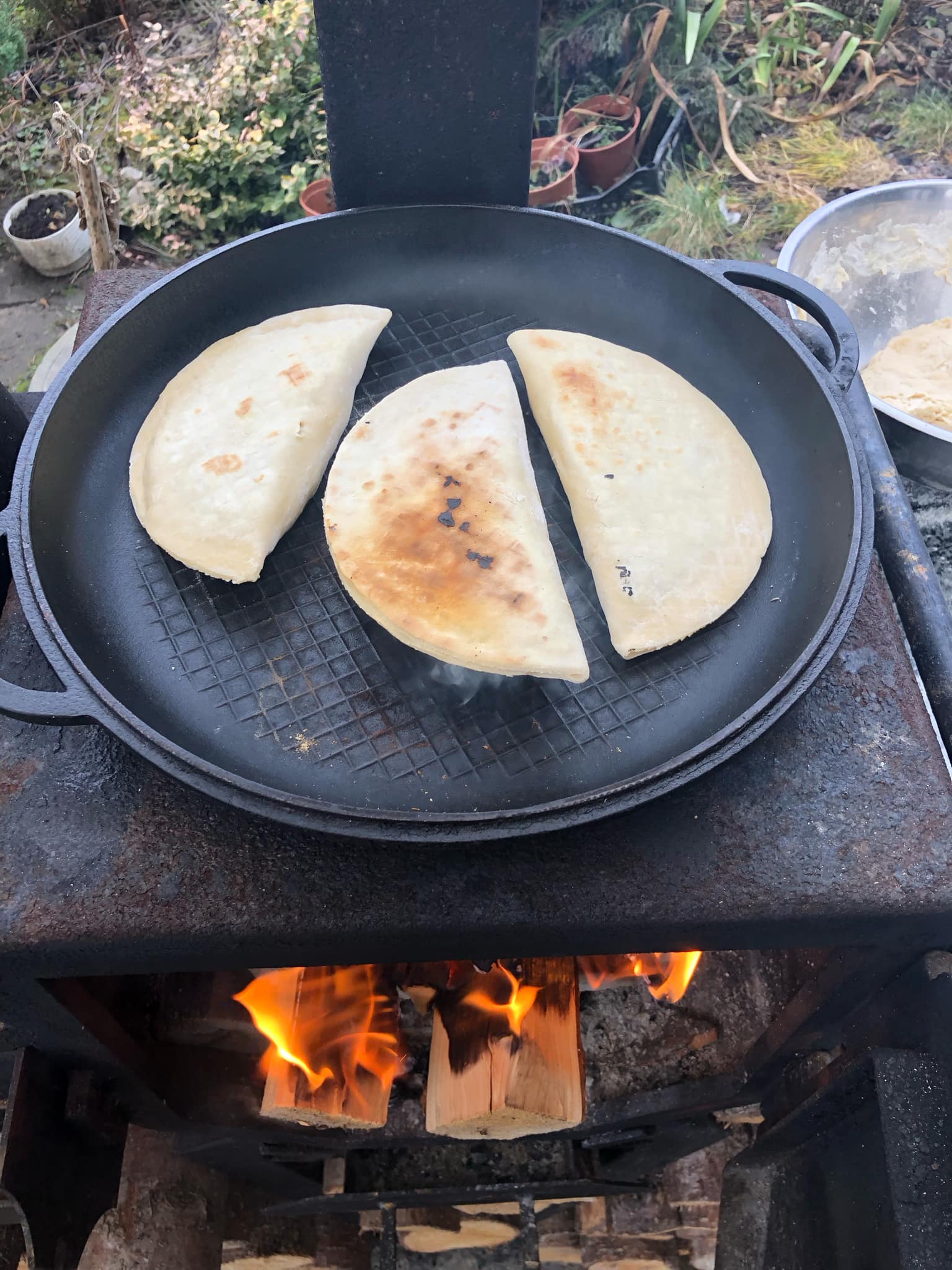 Смажити можна на плиті, температура – висока. У нашому ж варіанті вогонь та чавунна пательня. Може трохи піддимлювати та виглядати пригореним. Це через залишки борошна. Та й вогонь не завжди легко регулювати. У нас — досить присмажені