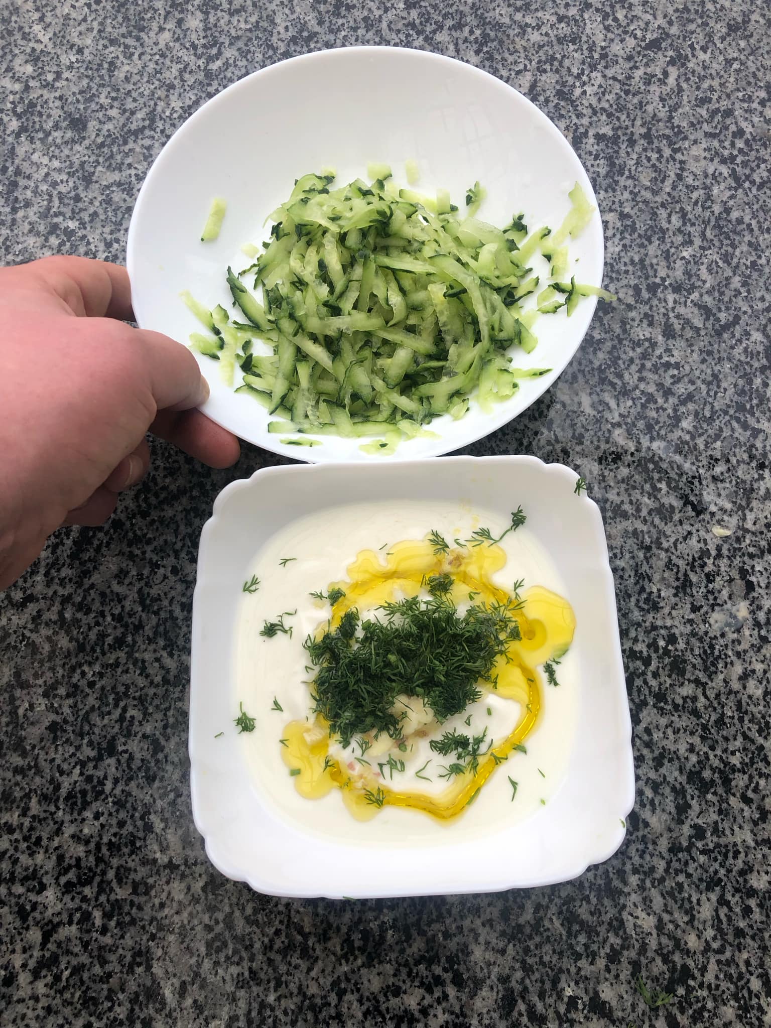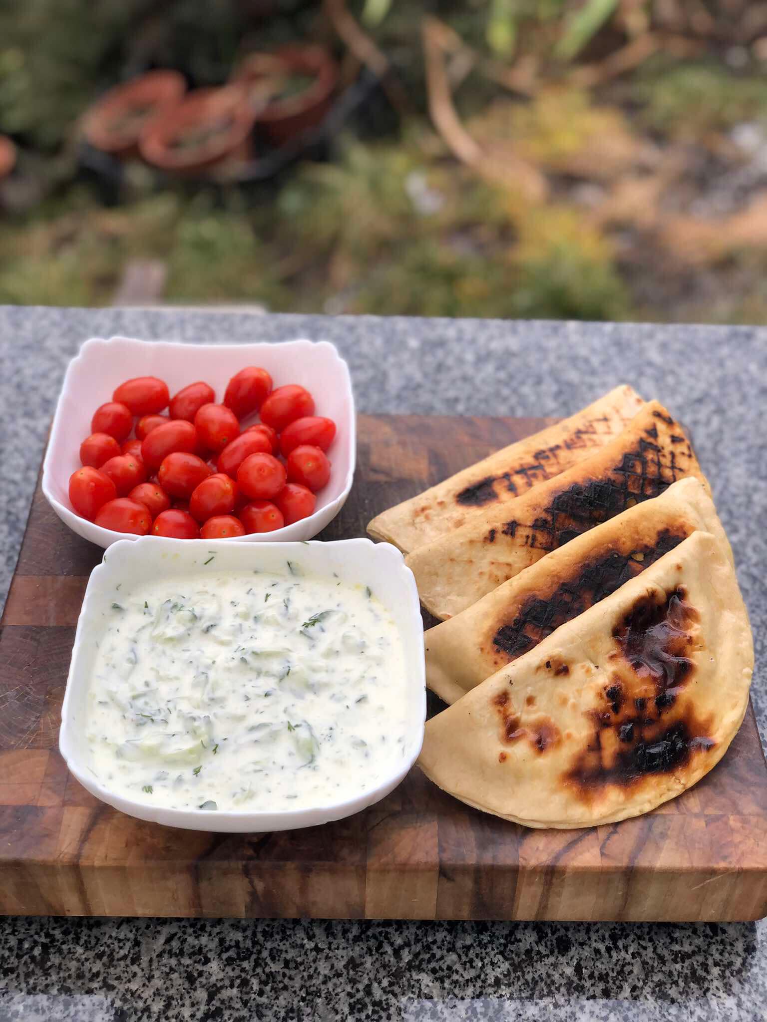 Для соусу в білий йогурт всипаємо натертий та відтиснутий від соку – свіжий огірок, трохи часнику, кріп, столову ложку оливкової олії, сіль. Скільки чого – питання смаку. Часнику, радимо, не багато, аби не затьмарював інші смаки