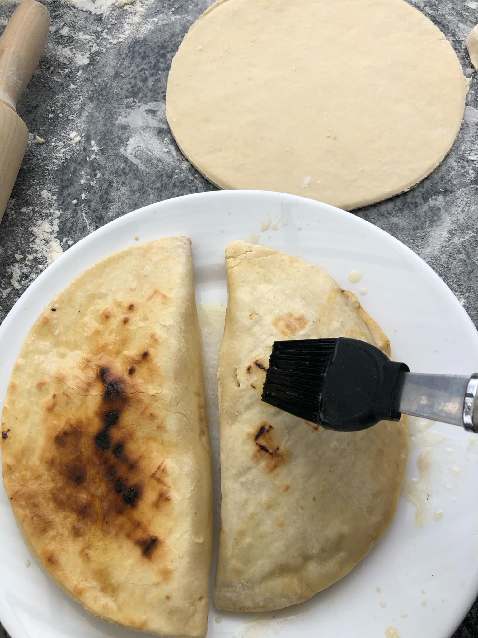 Чебуреки викладаємо на тарілку та прикриваємо фольгою — аби пропарились. Кожну нову порцію на попередню і знову загортаємо. Коли підстигнуть – всі разом прогріваємо на пательні чи духовці, щедро змащуємо розтопленим маслом, вкриваємо