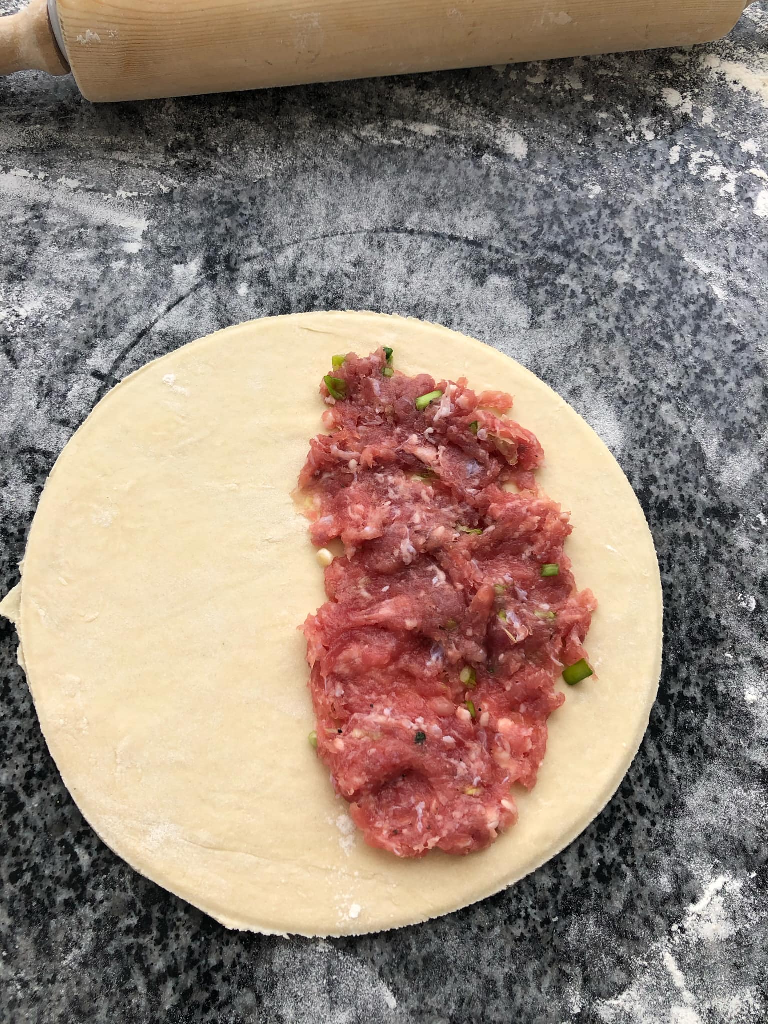 Товщина тіста для чебуреків – 2-3 міліметри. Викладаємо фарш на одну половину паляниці, але так, щоб залишалися вільні краї для скріплення