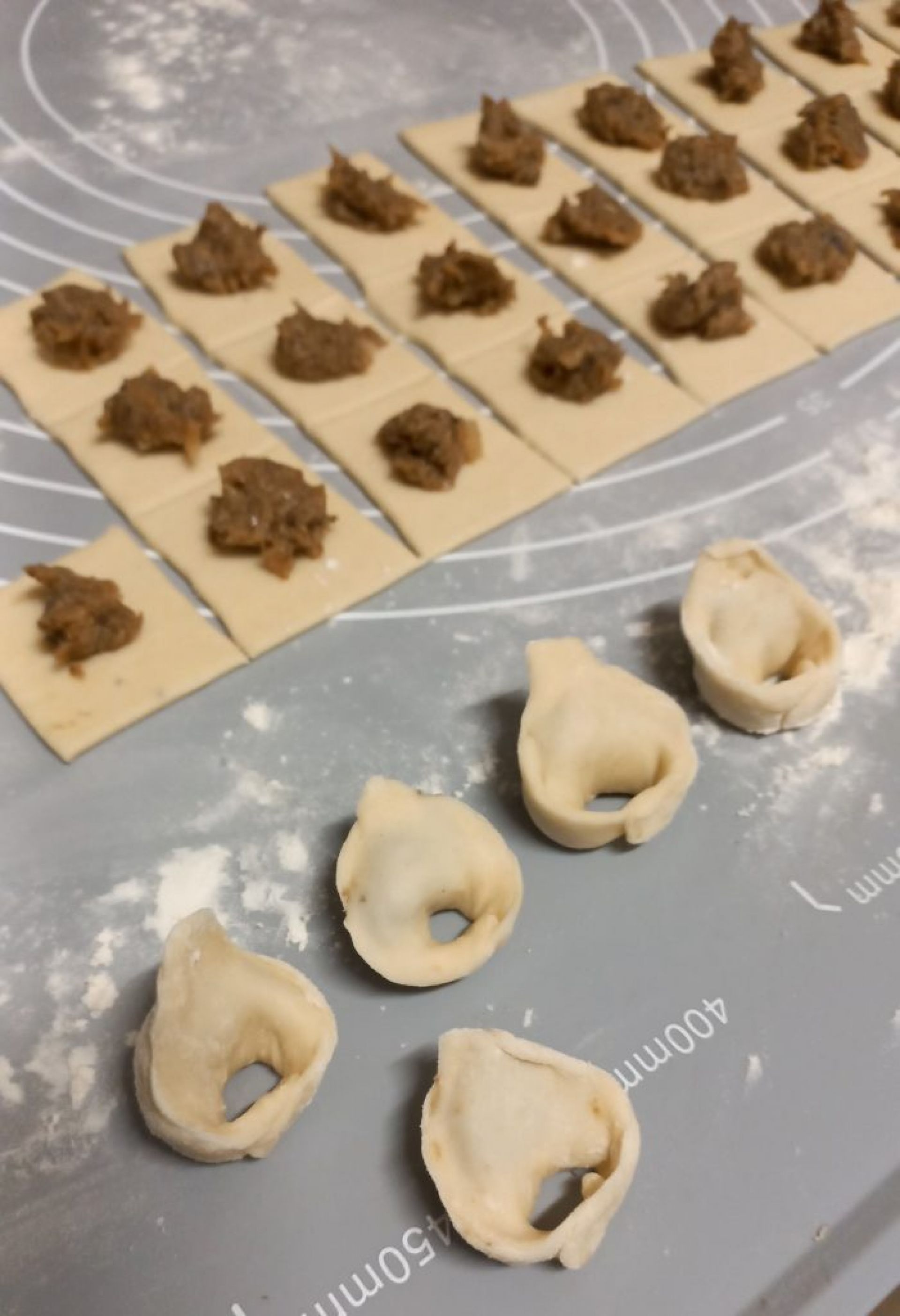 Тісто тоненько розвалкувати, вирізати квадратики 3х3 см, в кожен покласти трішки начинки. Зліпити вушка, зварити. Додавати в тарілки з гарячим борщем.
