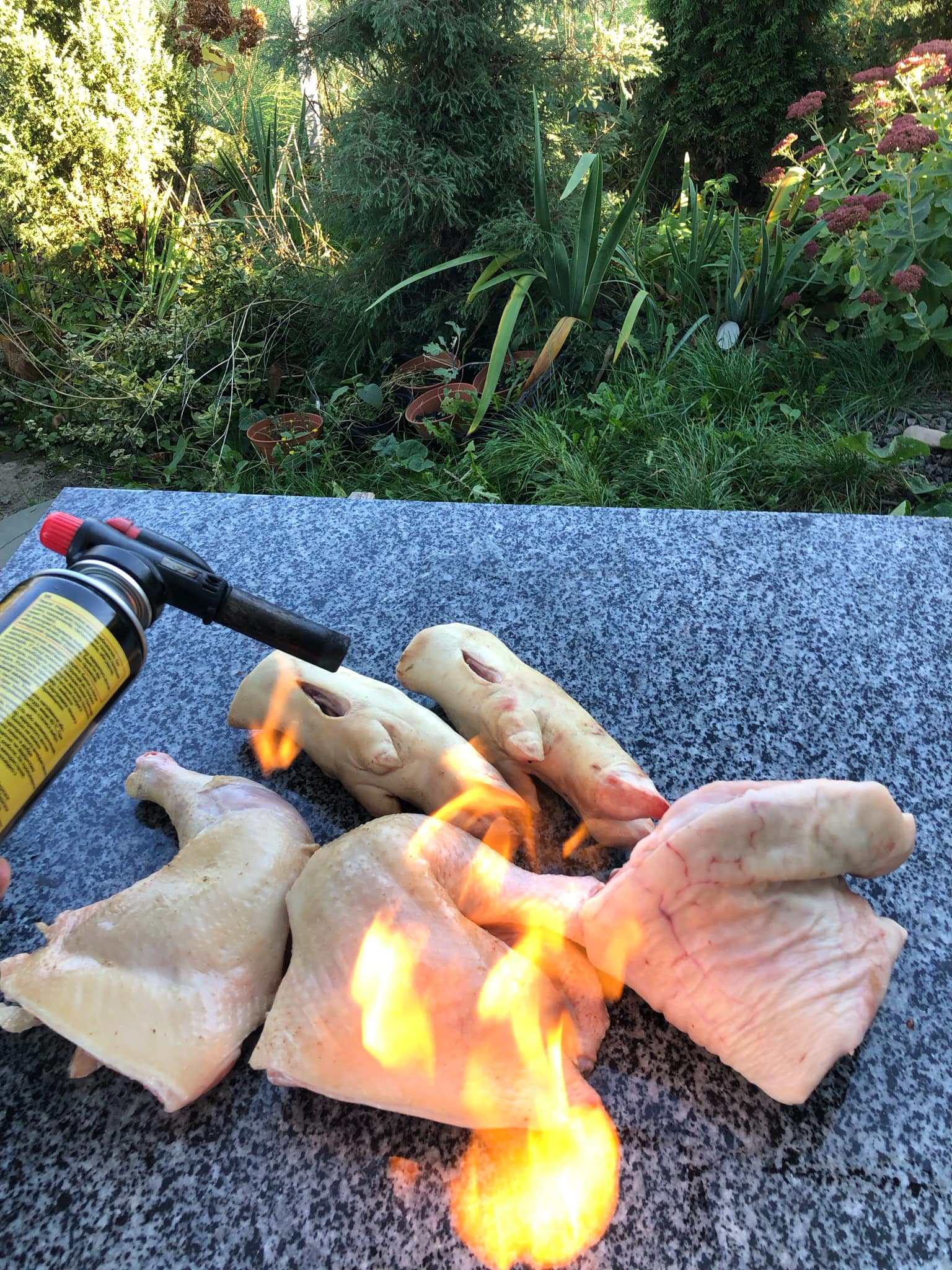 Ті частини, які зі шкірою – обсмалюємо пальником. Можна над плитою. Така дія додасть цікавого присмаку. Крім того, після обсмалювання, зішкрябаємо зайве, а це додаткова очистка. Після – замочуємо м'ясо
