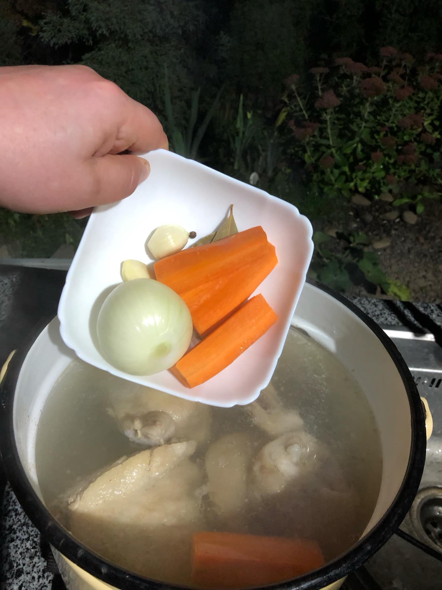 Закидаємо цибулю, часник, спеції та солимо. Кипіти, наголошую, не повинно. Мішати також не треба. Кількості води не лякайтеся, за сім годин варіння – майже половина випарується. Якщо ще буде піна чи жир — забираємо
