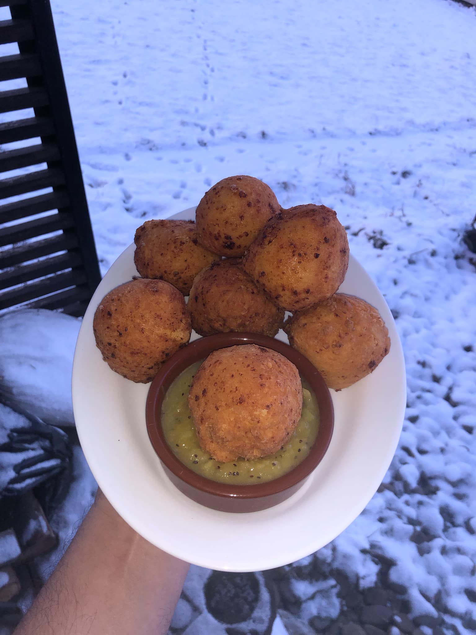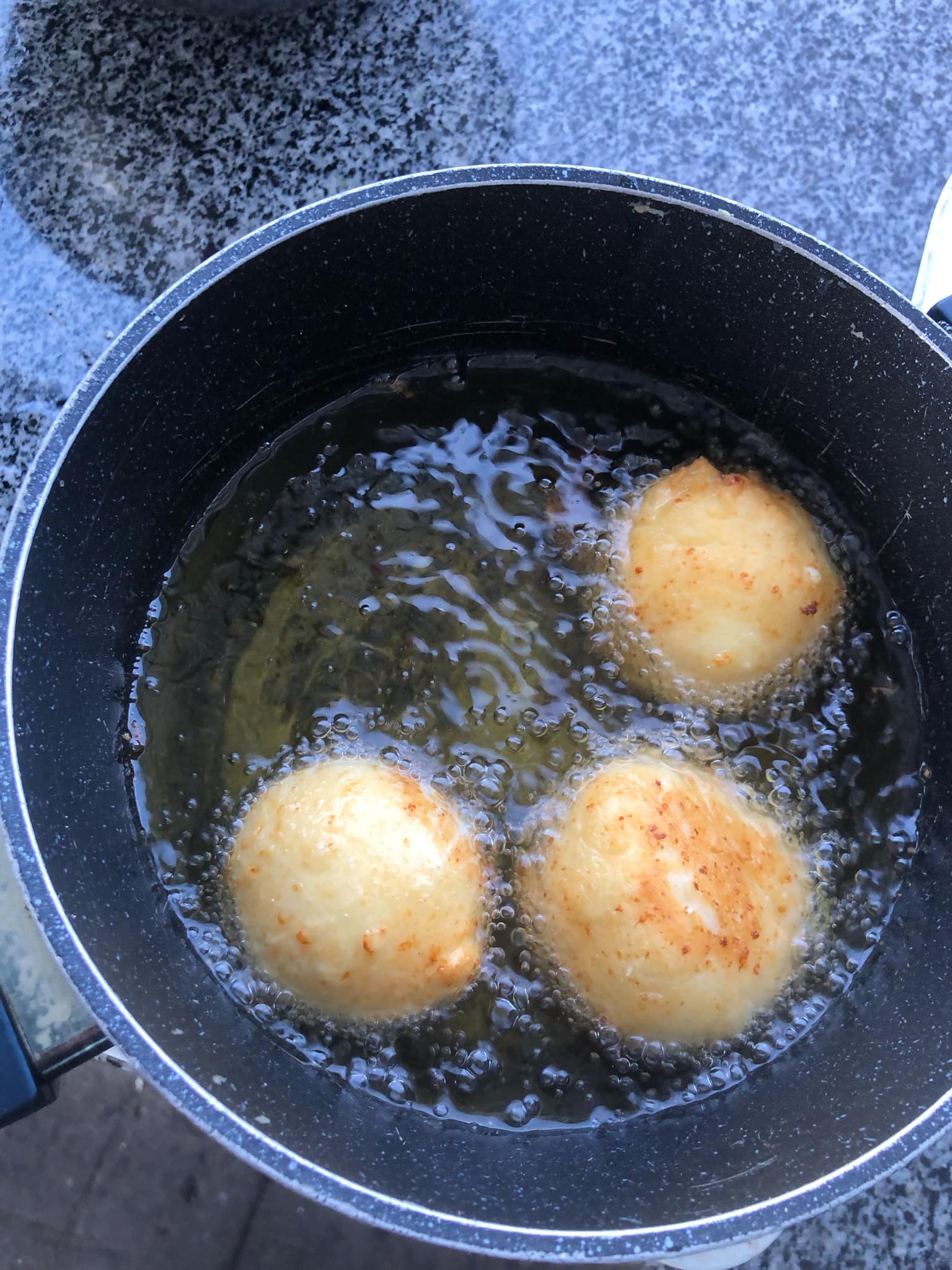Олії треба стільки, аби пампушки плавали. Розігріваємо до максимальної температури. Може трохи диміти, тому я смажив на вулиці. Закидаємо таку кількість, аби пампухам було вільно. Зважте, що тісто виростає майже вдвічі. Смажте хвилин 7-8