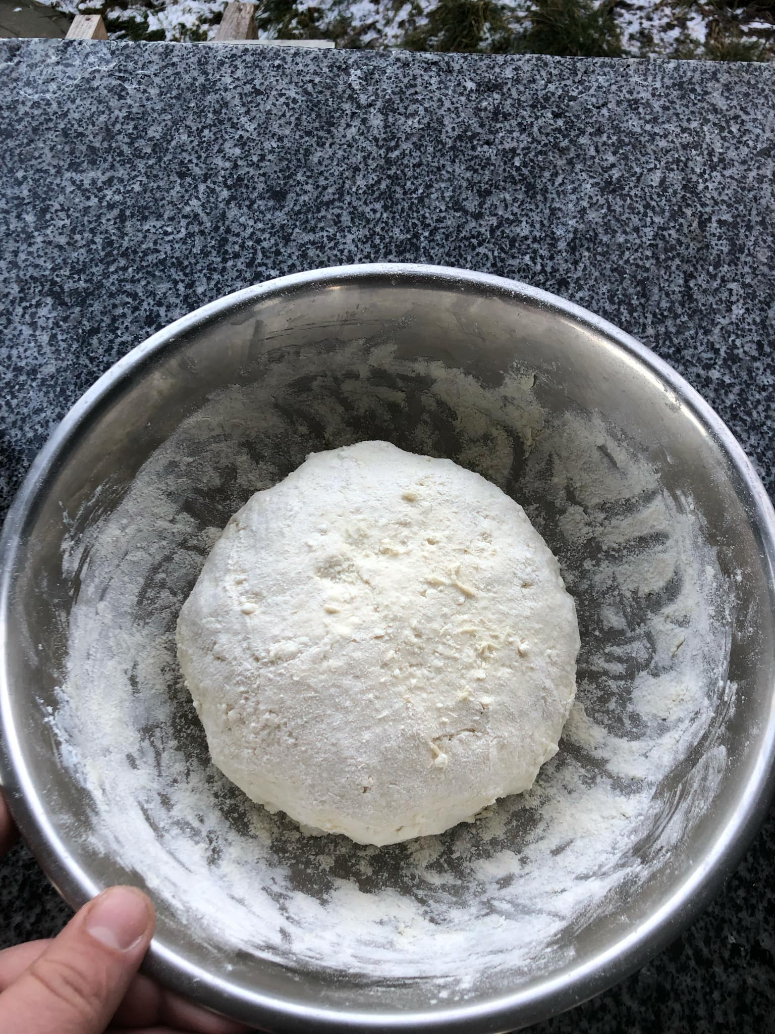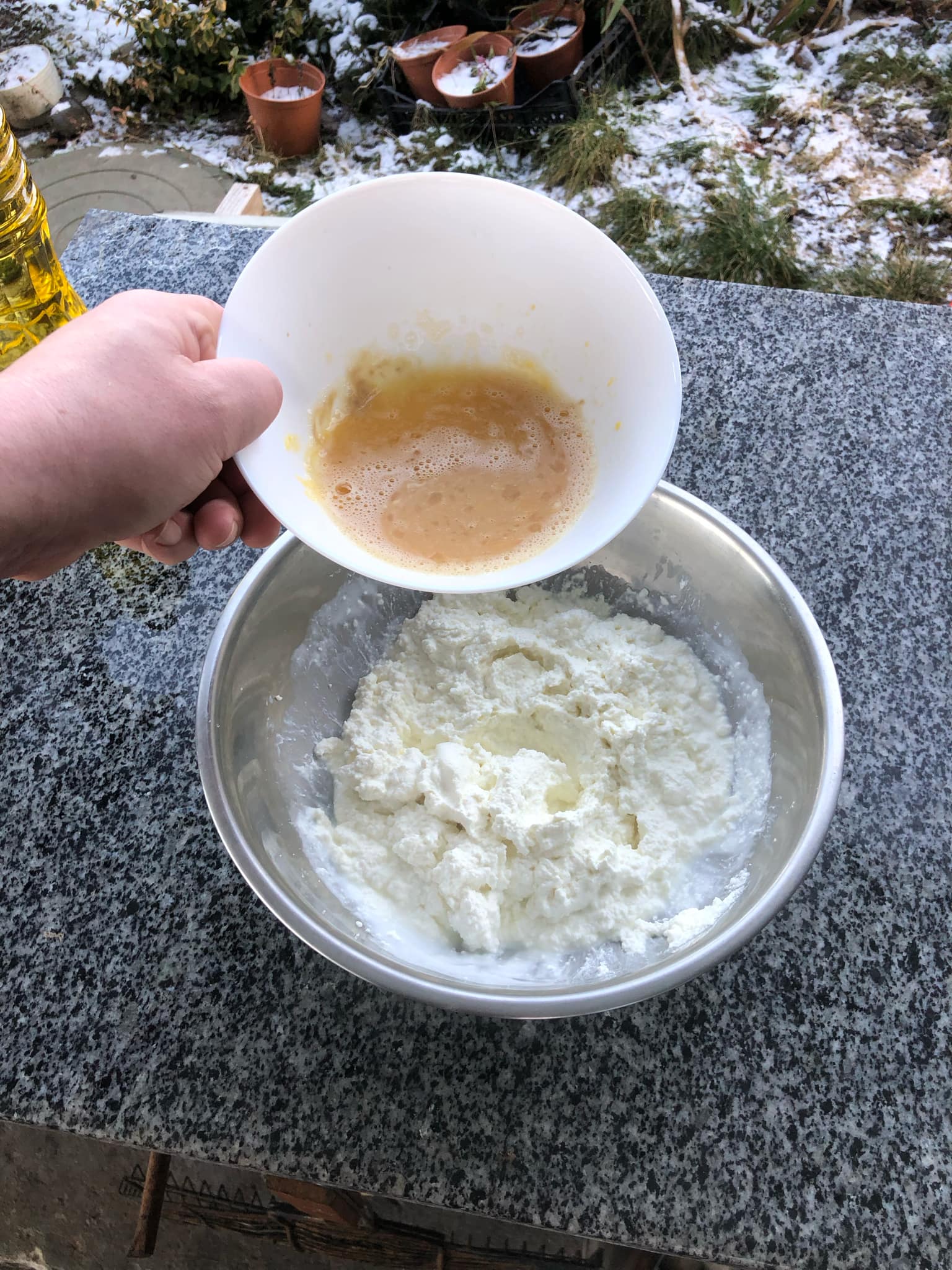Вимішуємо, підсипаючи борошно з розпушувачем, даємо ложку-дві алкоголю. Виминаємо 5 хвилин до стану «аби до рук не липло». Тісто залишаємо на пів години в прохолодному місці. Зазначу, що таке тісто піддається заморозці