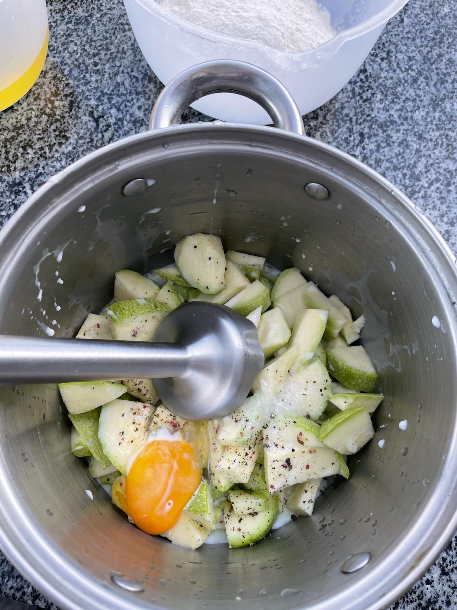 Готуємо тісто на кабачкові млинці. Кабачки ріжемо так, аби блендер міг впоратись, вливаємо молоко, додаємо спеції, терту цибулю, яйце. Усе перебиваємо блендером і поступово додаємо борошно. Гарно вимішуємо та даємо 20 хвилин відпочити