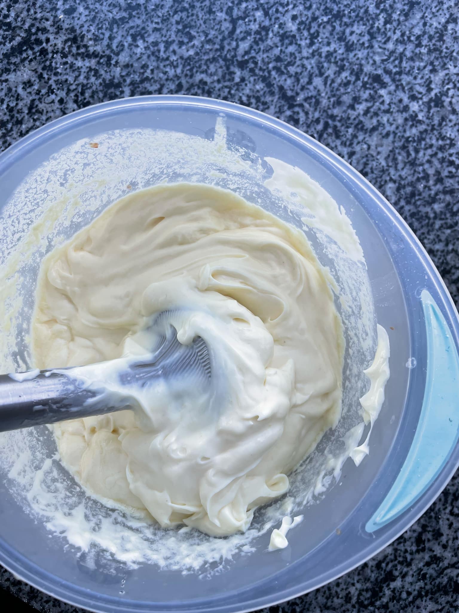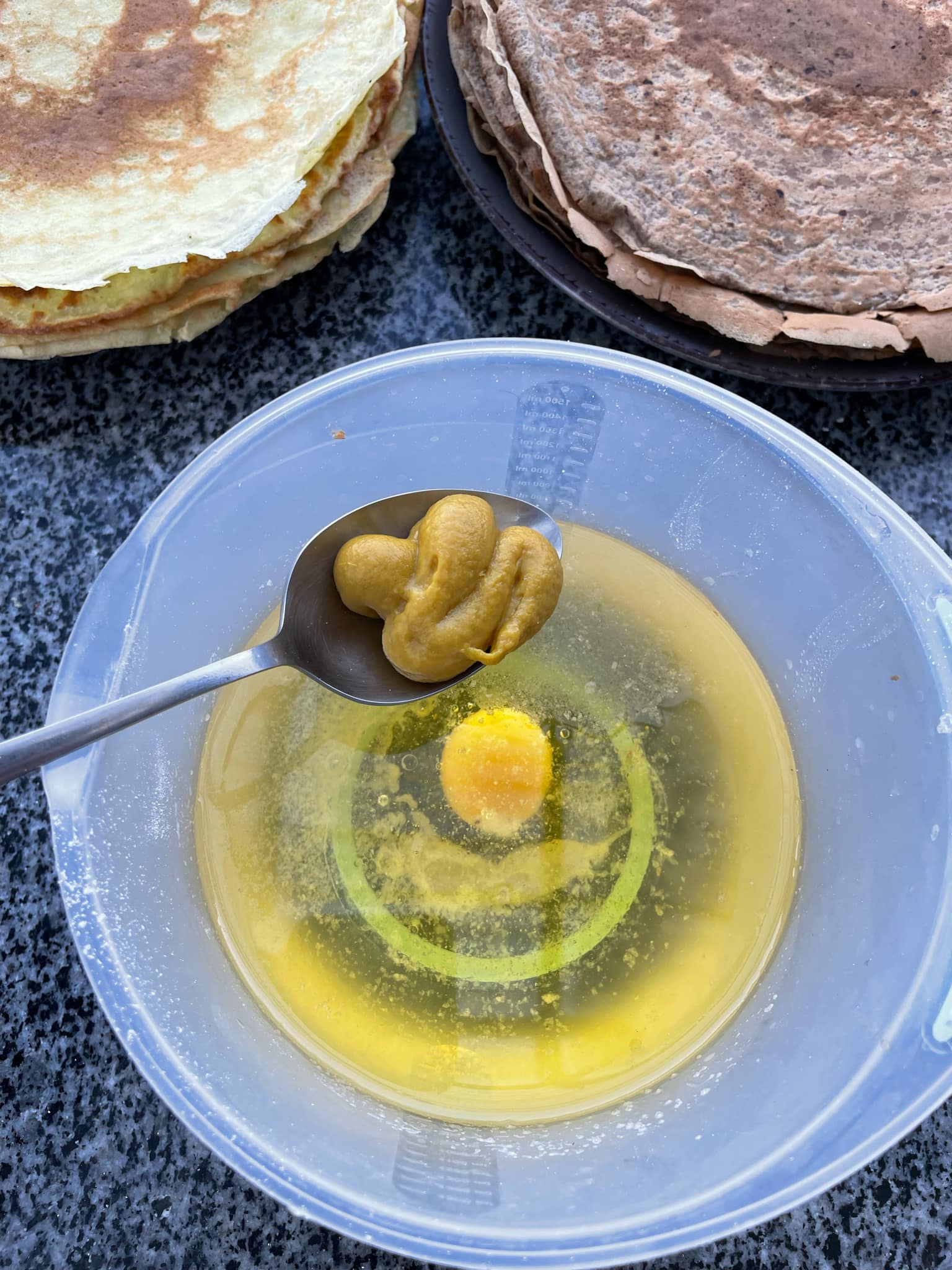 Поки млинці холонуть, робимо майонез. В олію вкидаємо та вливаємо усі наші інгредієнти та збиваємо блендером. З допомогою яєць можна регулювати консистенцію: якщо вам потрібен рідкий соус – одне яйце, більш густий – два