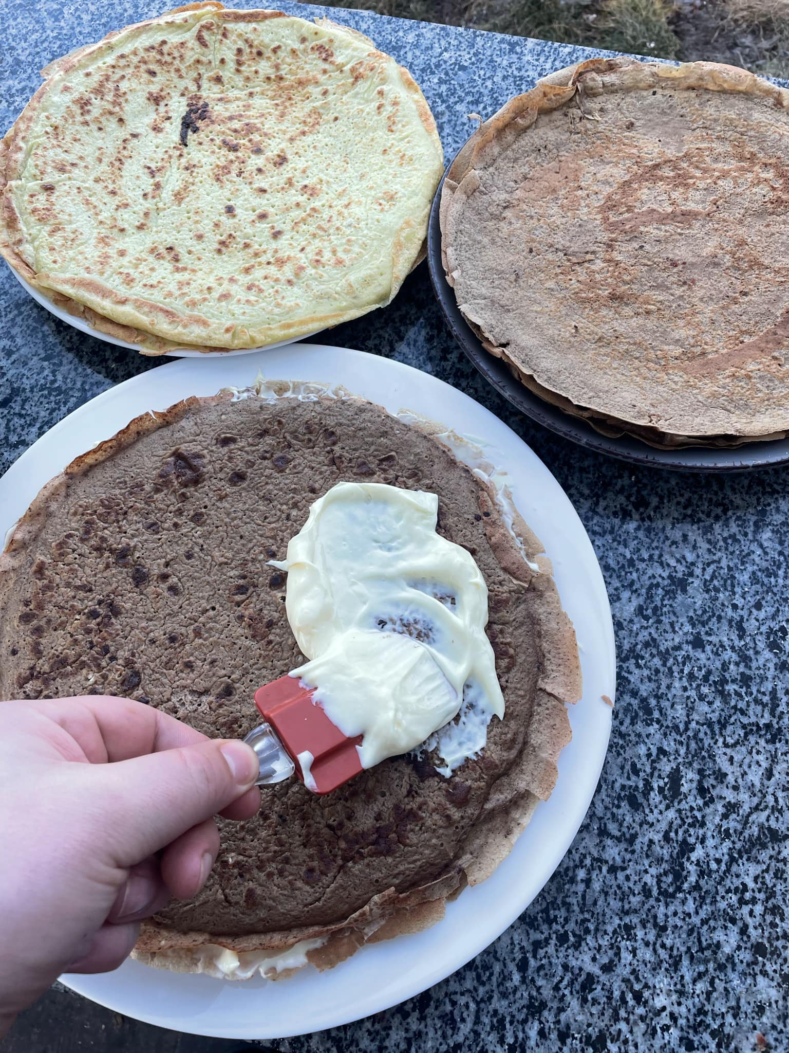 Щедро змащуємо кожен млинець майонезом, чергуючи млинці з печінки та з кабачків. З кількістю майонезу – не переборщите, бо млинці його добре «втягують». Якщо ви на здоровому харчуванні, то майонез можна замінити крем-сиром