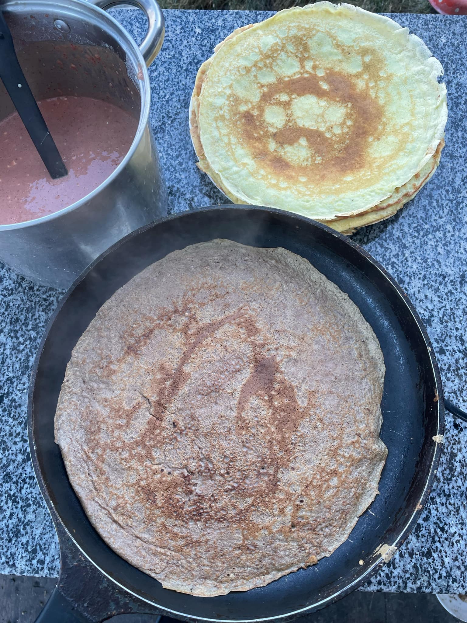 З печінковими млинцями — алгоритм дій той самий. Пропорції молока і борошна – однакові. Важливо аби молоко було жирним. Борошно буває різним, тому оцінюйте тісто «на око» — має бути щось проміжне між тістом на класичні млинці і оладки