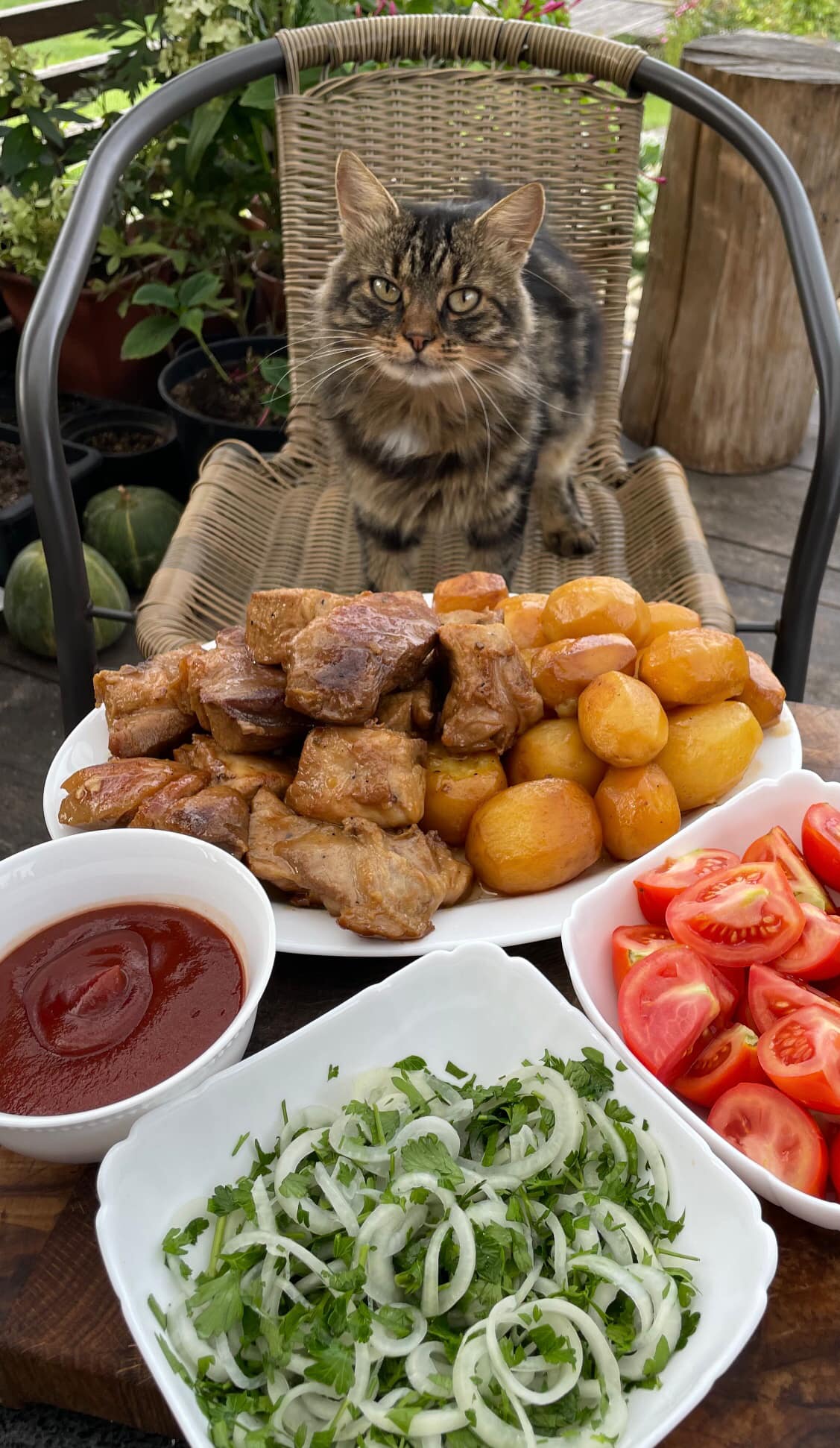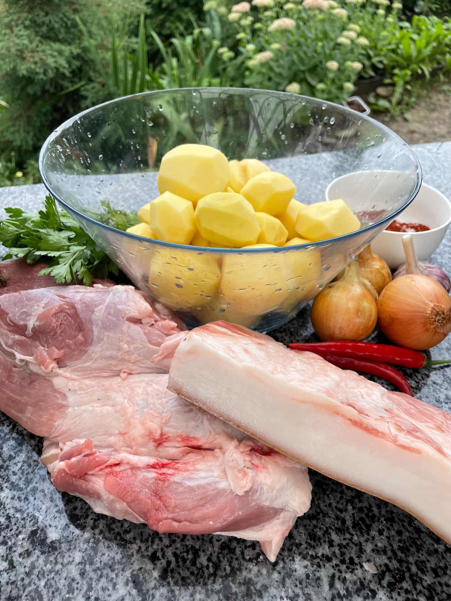 Усі потрібні інгредієнти – на фото. Пропорції м’яса і картоплі – один до одного. Але якщо м’яса не багато, а гостей трохи прийшло, картоплі може бути більше. За час приготування вона набуває багато смаку