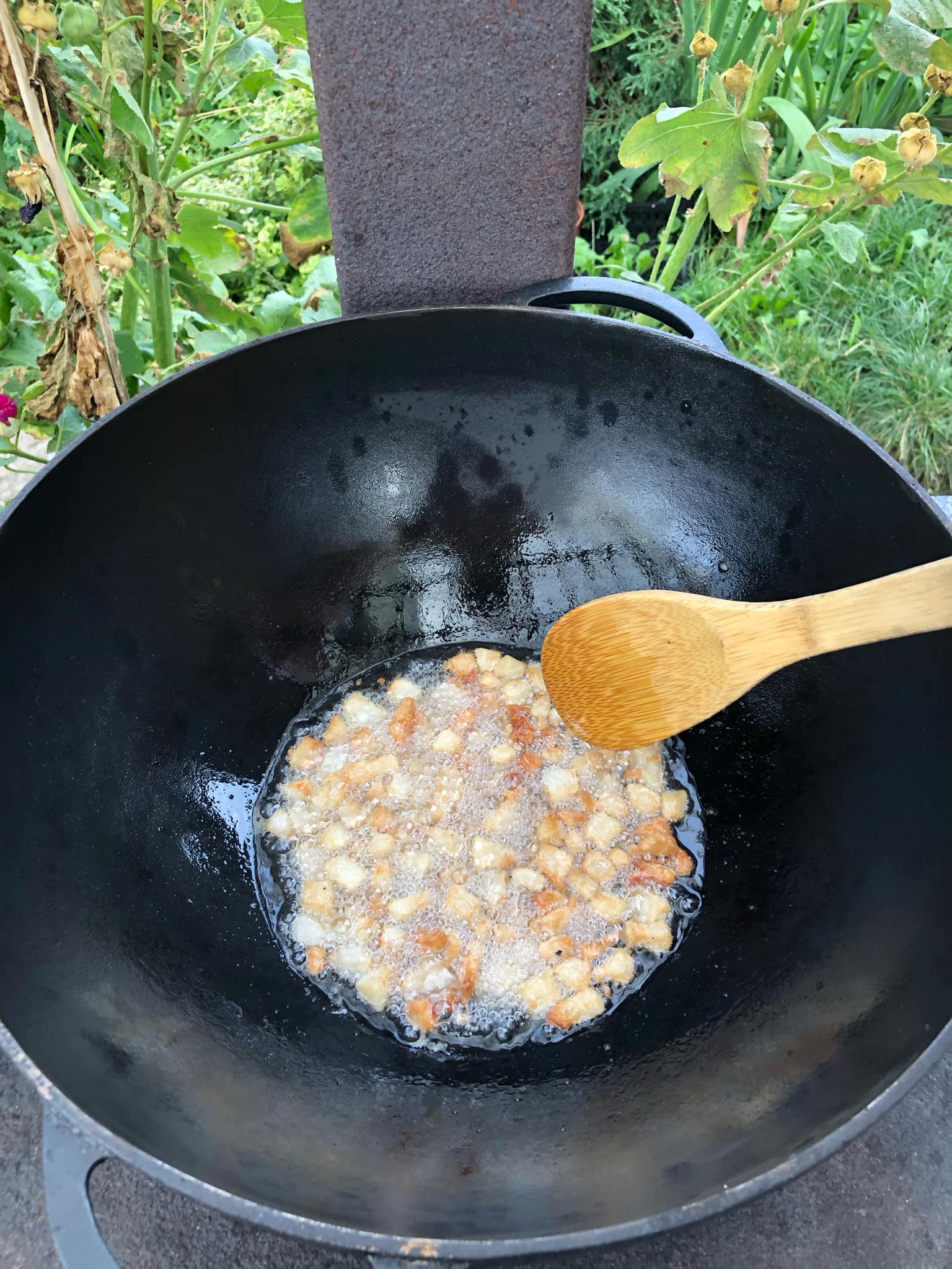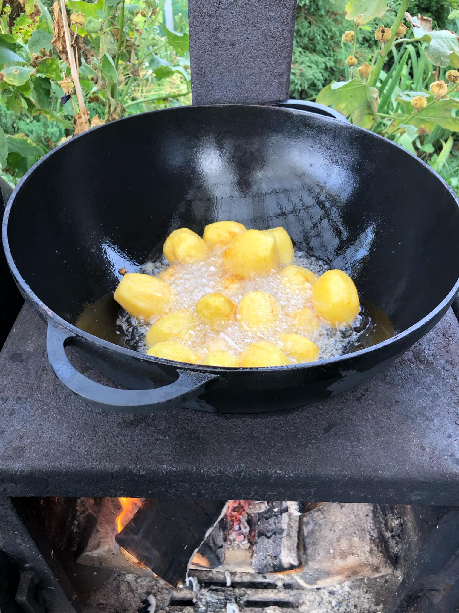 На інтенсивному вогні просмажуємо картоплю. Дрібну і середню бажано готувати цілою. Смажимо до золотистої шкуринки, можна й більш сильно. Картоплю виймаємо