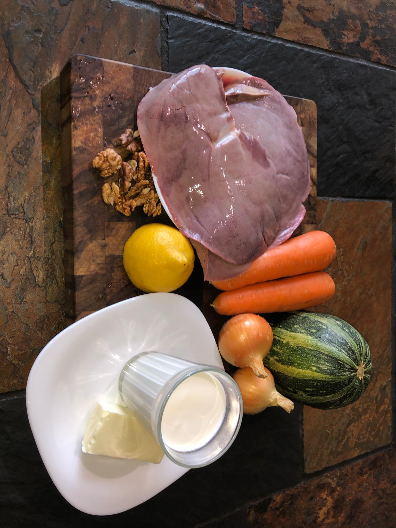 Для цієї страви нам потрібна печінка, кабачок, вершки та масло, морква з цибулею, а також горіхи. Лимон необхідний, аби забрати гірчинку й інтенсивний смак печінки