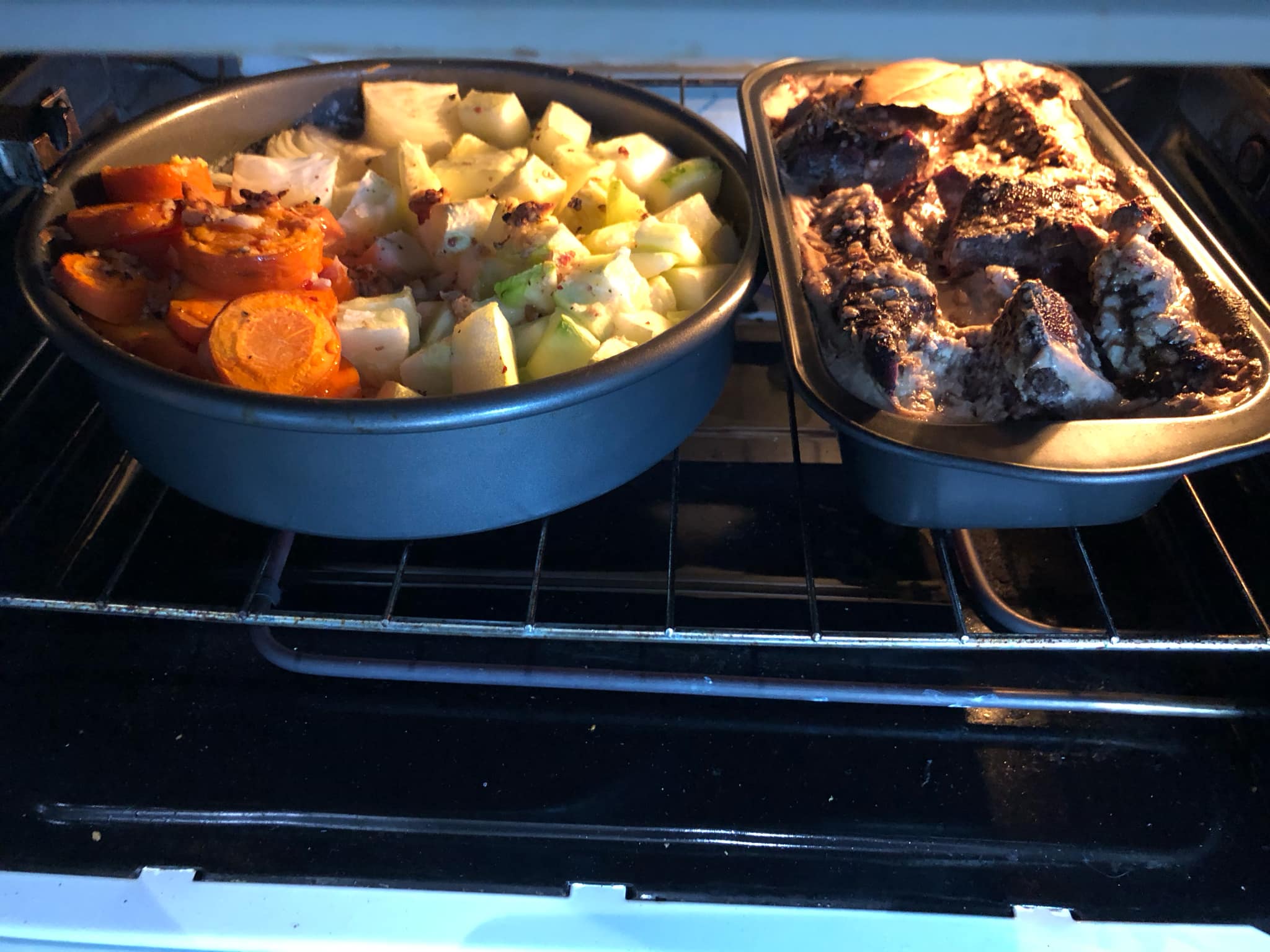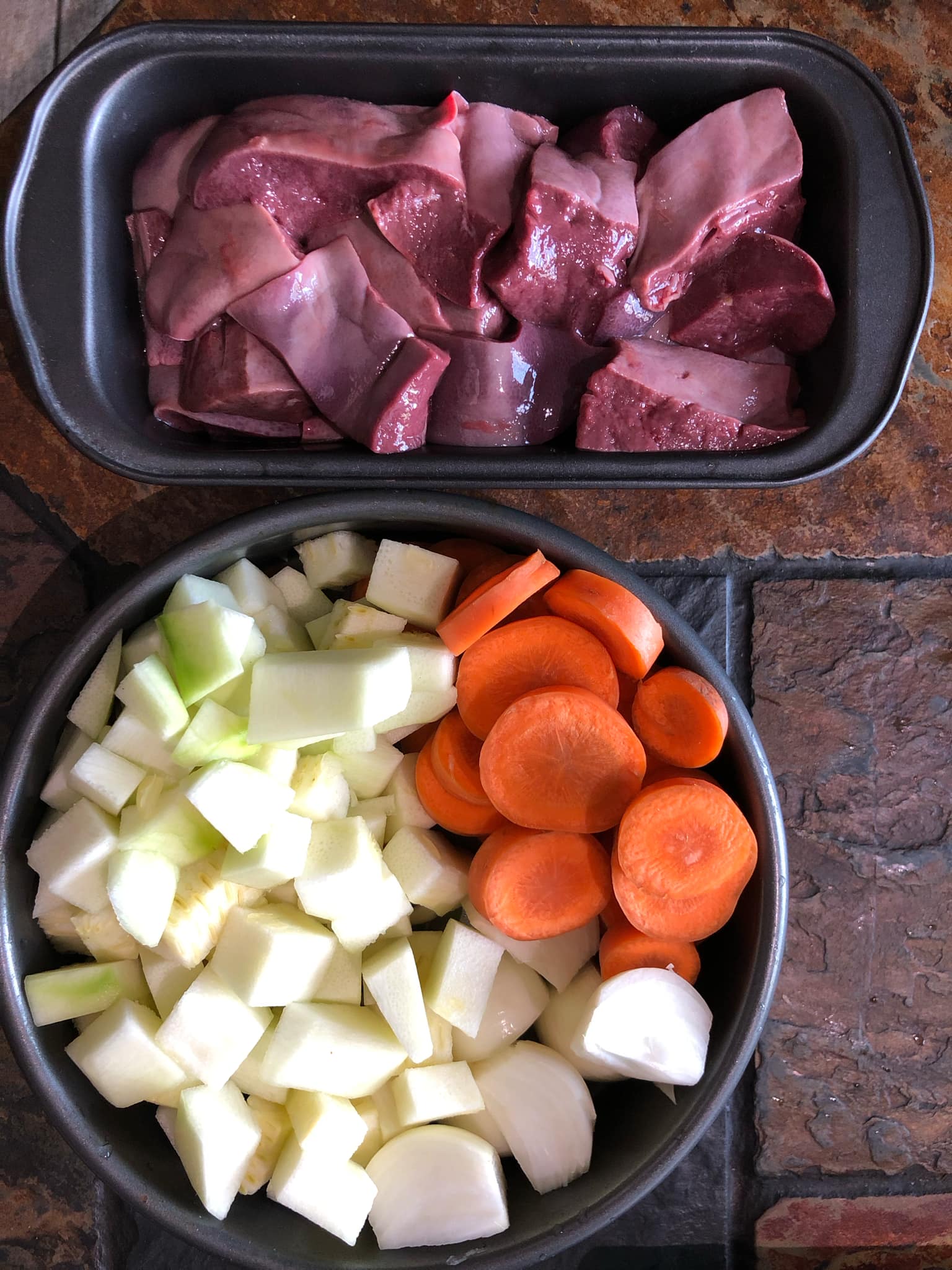 Потрібні дві форми для запікання. В одну нарізаємо печінку, в іншу – овочі. Шматки не великого розміру – так, аби швидко пропеклися