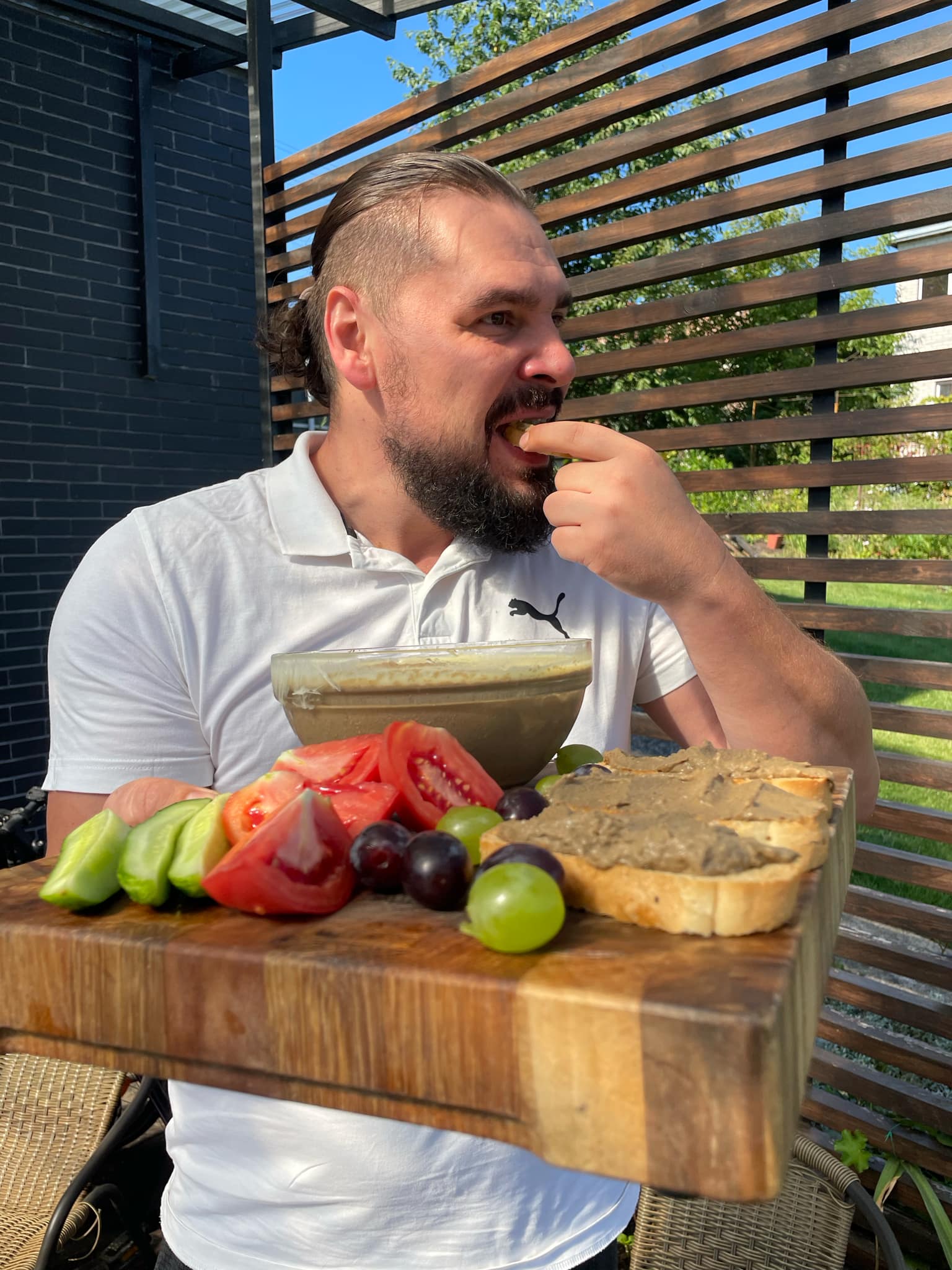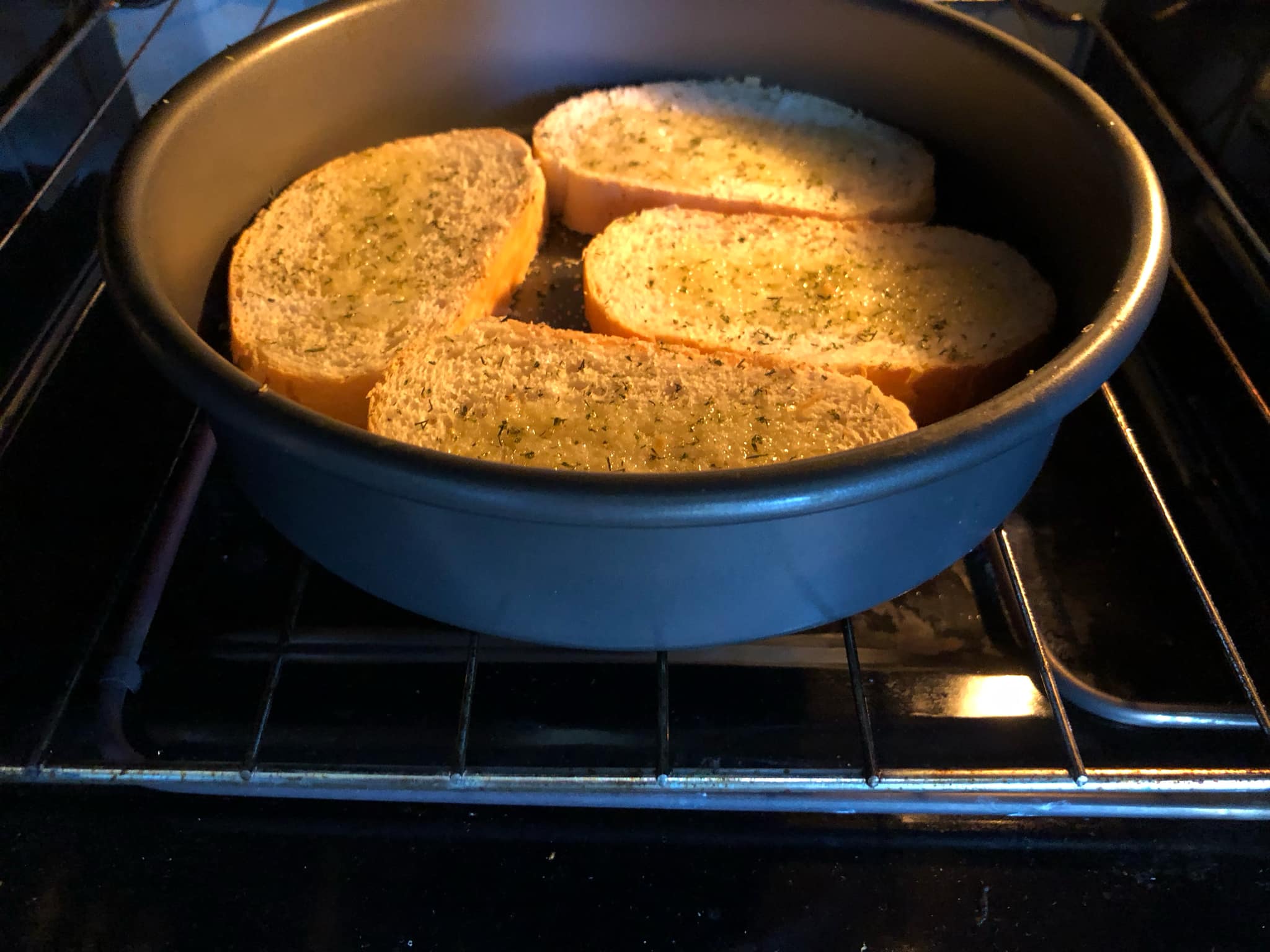 Поки паштет застигає в холодильнику – підготуємо грінки. Звичайний батон солимо, додаємо спецій, зверху шматок масла чи олію і на 15 хвилин у духовку