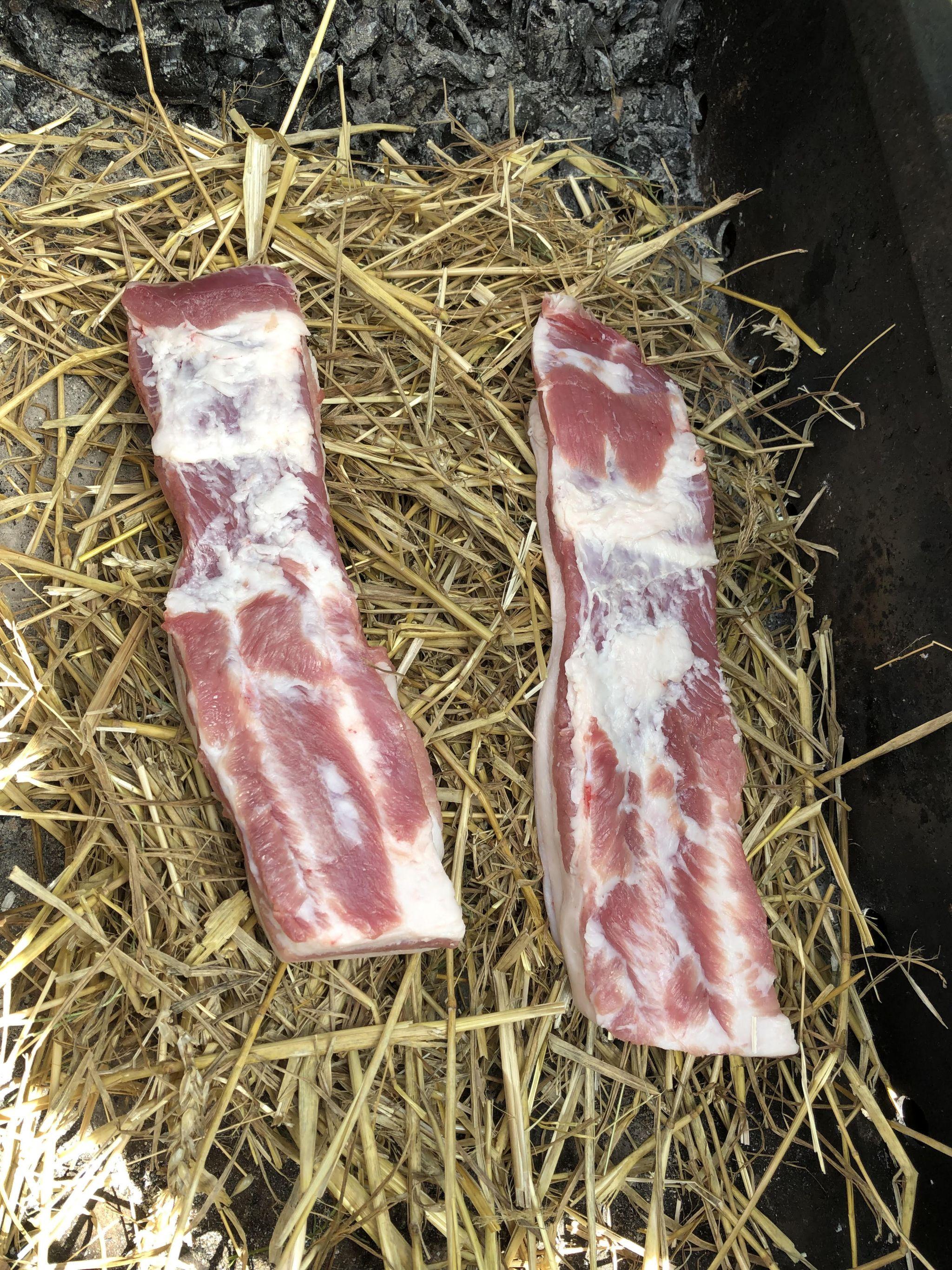 Грудинку покладіть на солому. Аби сантиметрів за п’ять хоча б було. Засипте її зверху