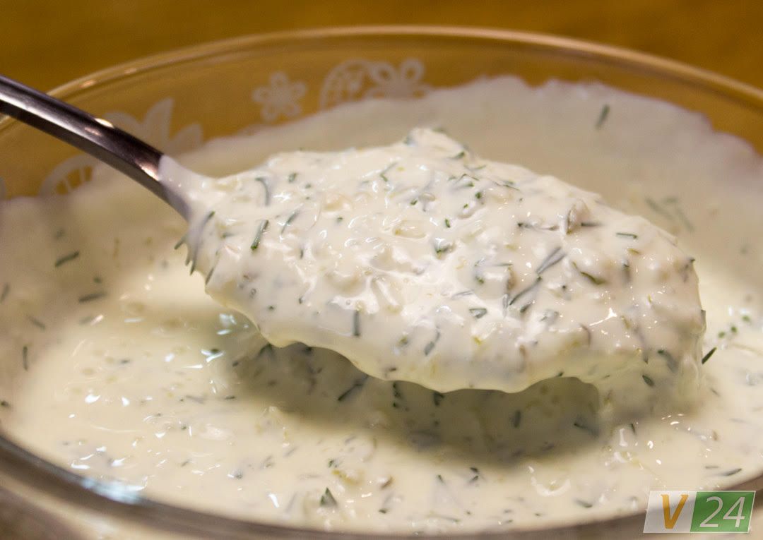 Гарно доповнить смак такого сала простий соус до смажених, печених чи копчених страв. Змішайте сметану, гірчицю в зернах, кріп та часник. Посоліть