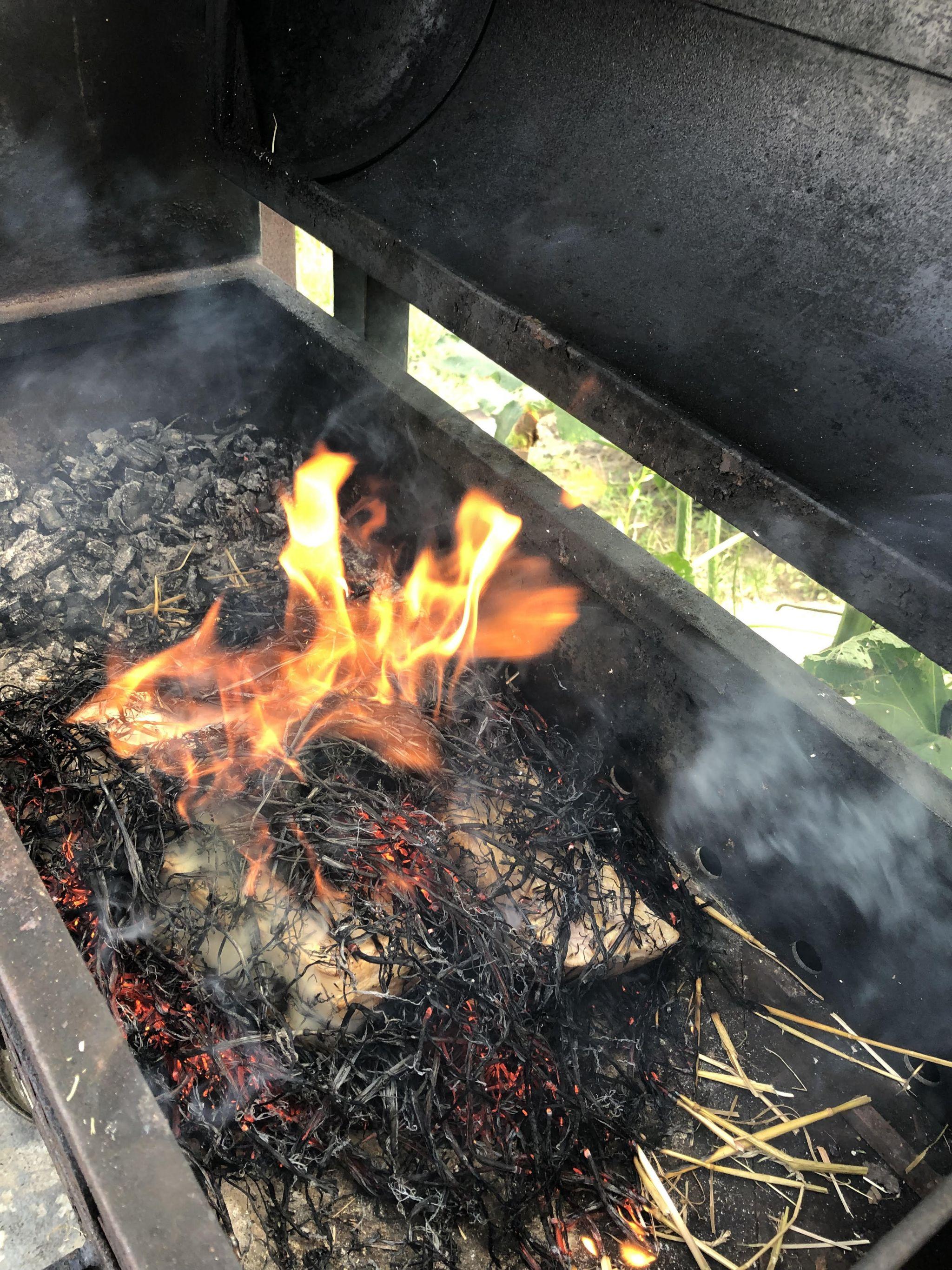 Не лякайтесь інтенсивного горіння, яке буде. Продукт не згорить. Дочекайтесь, аби все вигоріло, хвилин п’ять ще залишайте в попелі