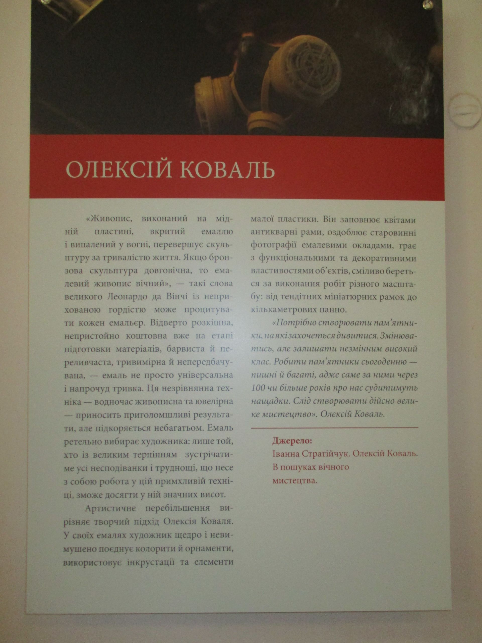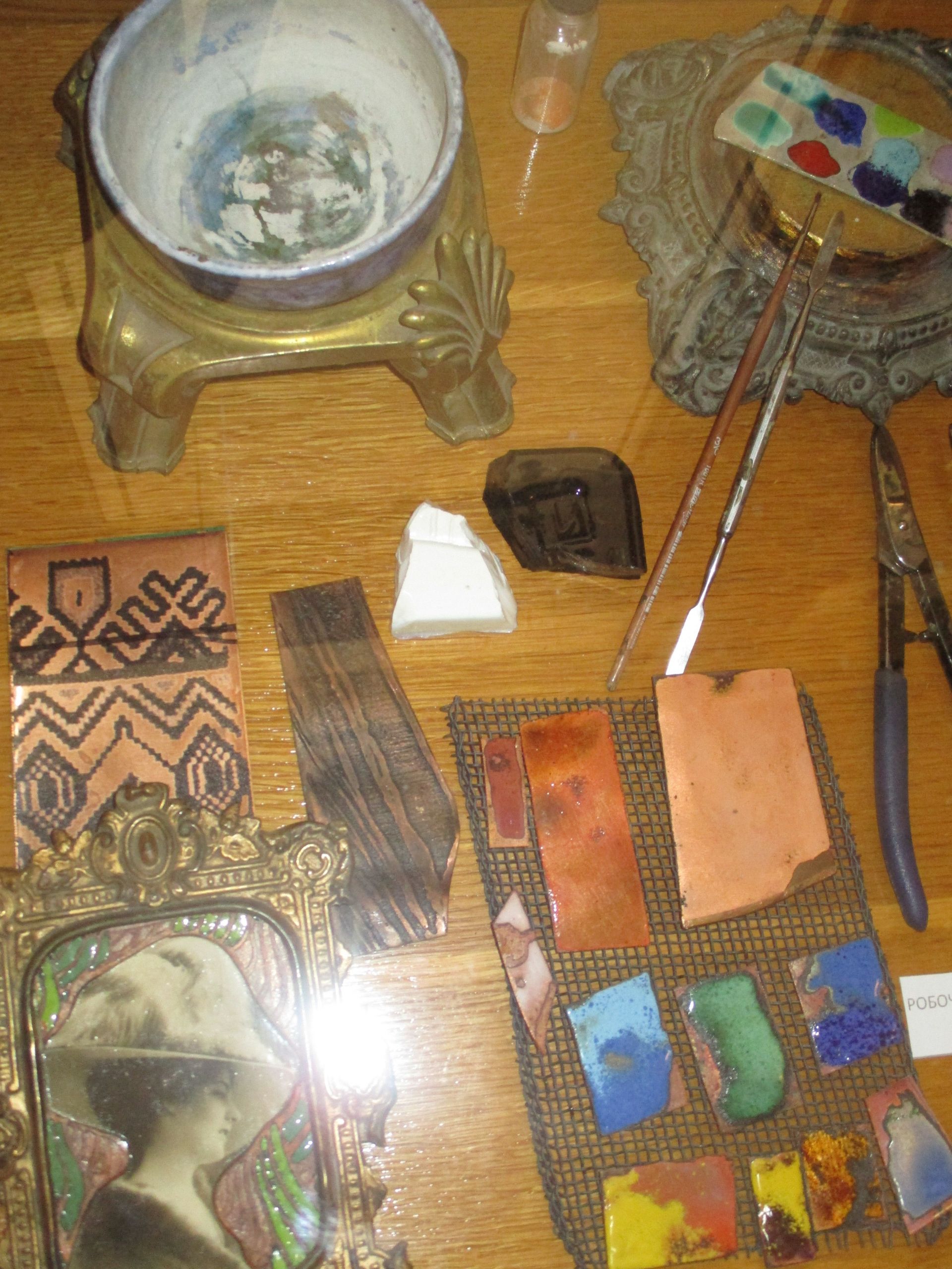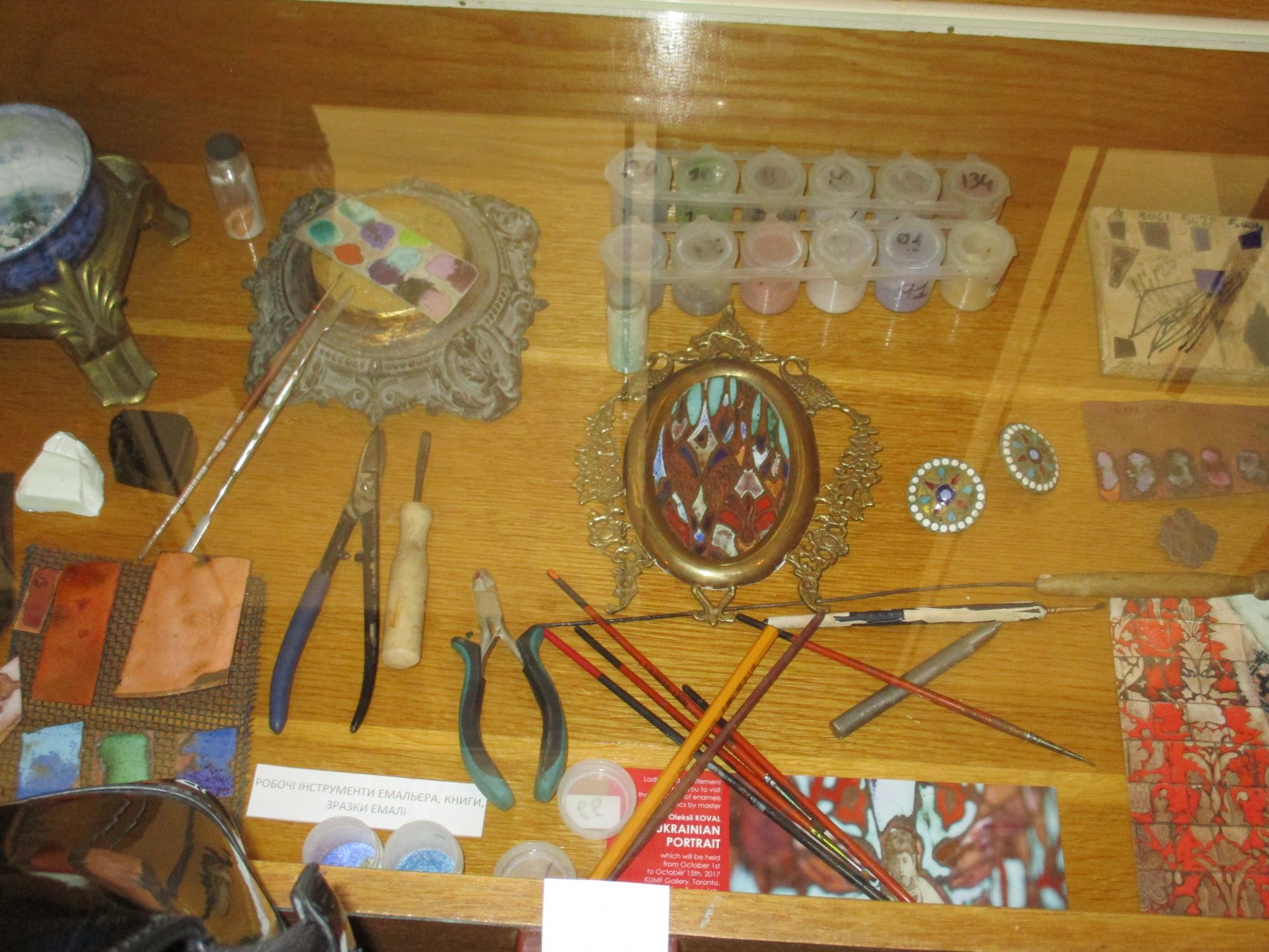 До речі, Олексій Коваль представив не лише свої твори, а й тематичні стенди про мистецтво емалі, відповідну літературу і, навіть, свою творчу кухню – зразки емалі, інструменти, якими працює тощо.