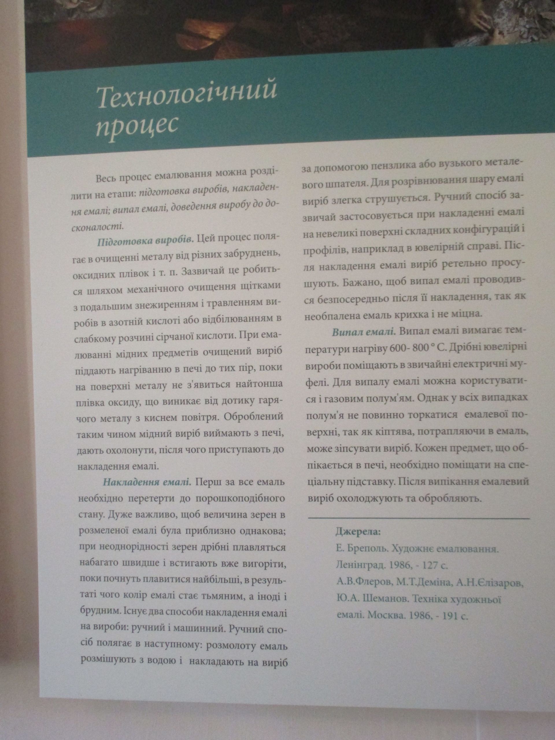 Техніка емалі — живописна та ювелірна водночас. Вона приносить приголомшливі результати, але підкоряється небагатьом. Лише той, хто із великим терпінням зустрічатиме усі несподіванки і труднощі, зможе досягти в ній значних висот.
