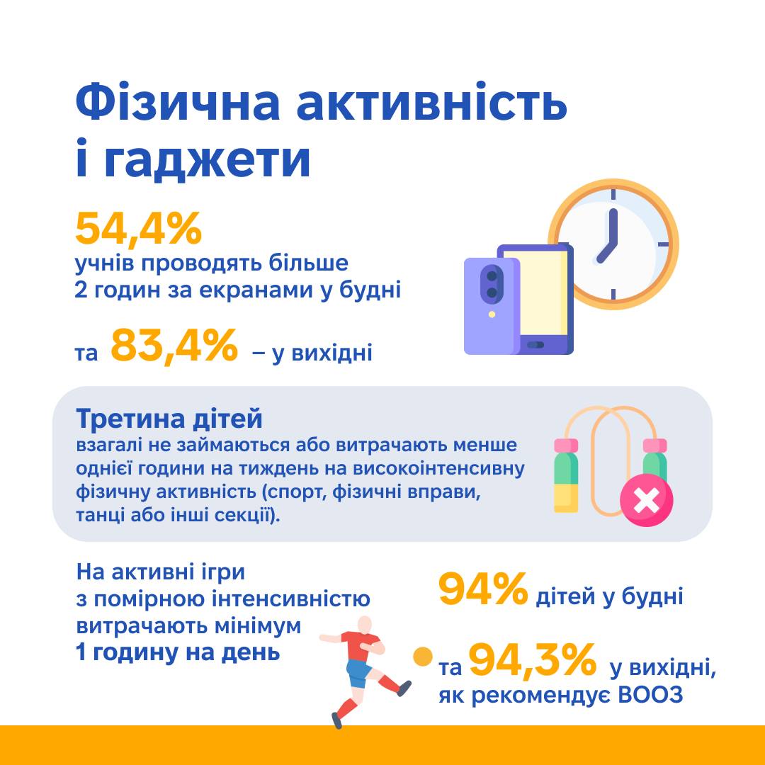 - 54,4% школярів проводять понад 2 години за ґаджетами у будні, у вихідні – 83,4%.