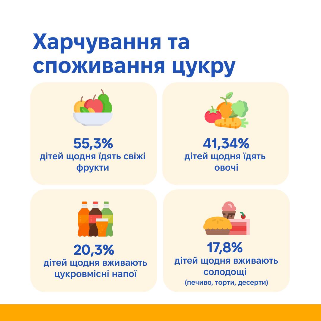 - Щодня цукровмісні напої вживають 20,3% дітей, а солодощі (печиво, торти, десерти) — 17,8% дітей.