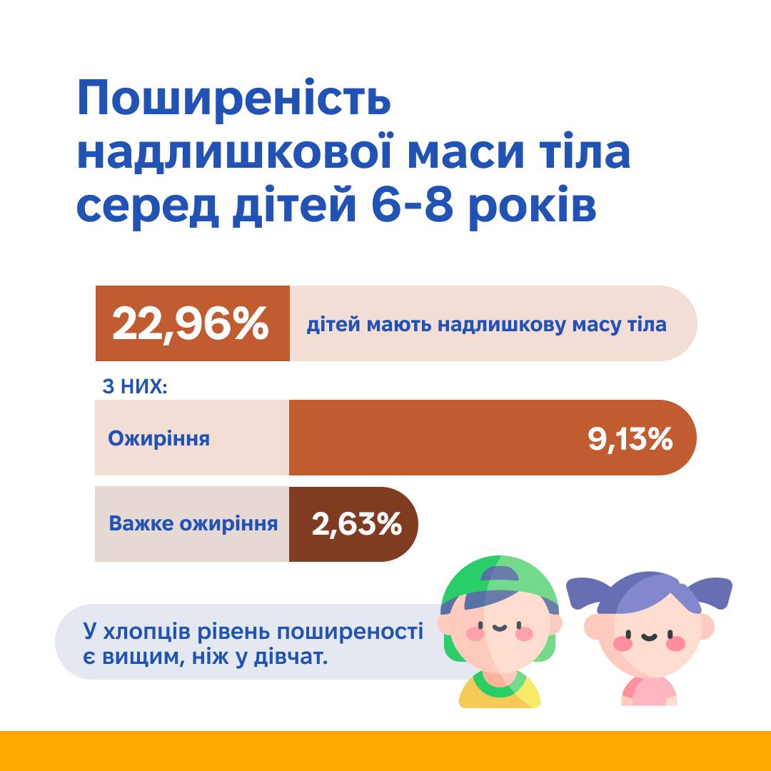 - 22,96% дітей мають надлишкову масу тіла, з них 9,13% страждають на ожиріння.