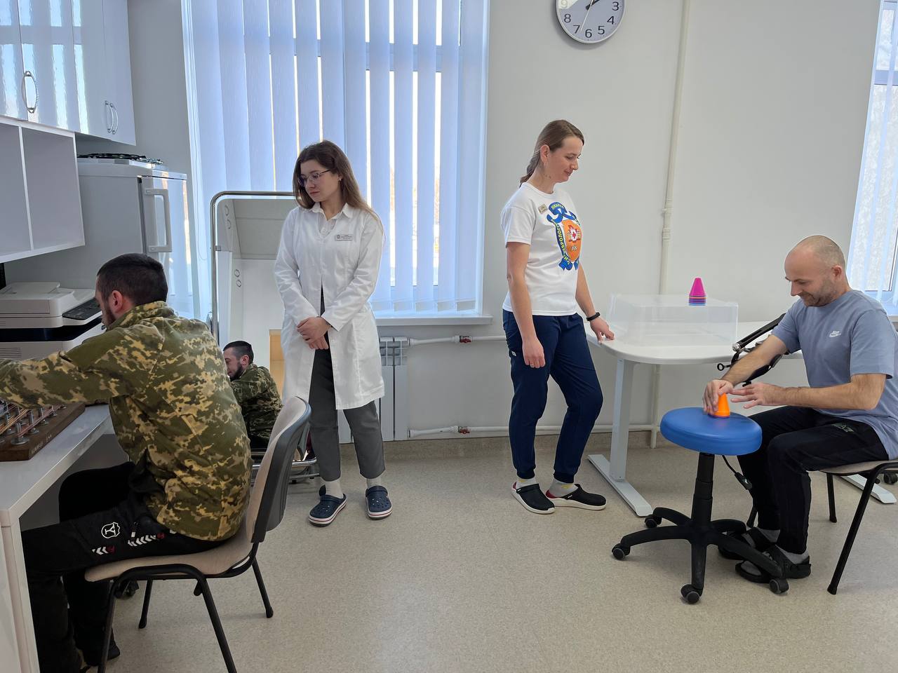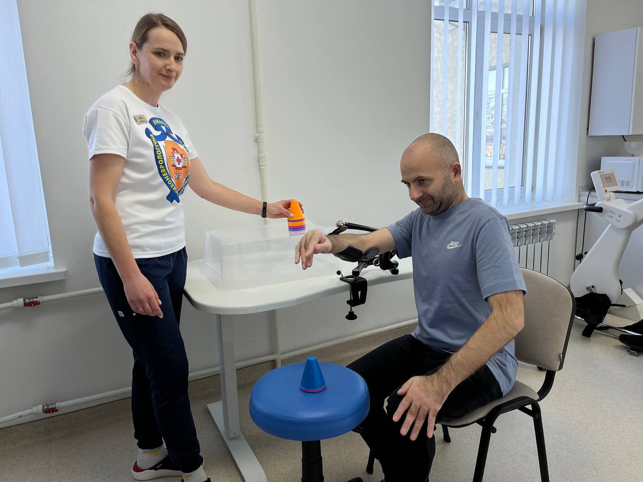 Зараз ерготерапевтка Ольга Осадчук працює з пораненим бійцем двічі на день. На заняттях пан Володимир виконує вправи для зміцненням сили та витривалості верхніх кінцівок. Особливу увагу приділяють правій руці.