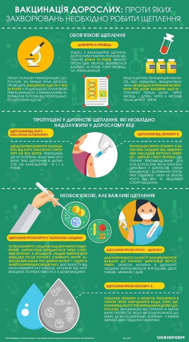 Дорослі ж повинні ревакцинуватися (вакцинуватися повторно) кожні 10 років. Тобто якщо востаннє ви робили щеплення у 16, то першу ревакцинацію слід зробити в 26 років, другу - у 36 і так далі.