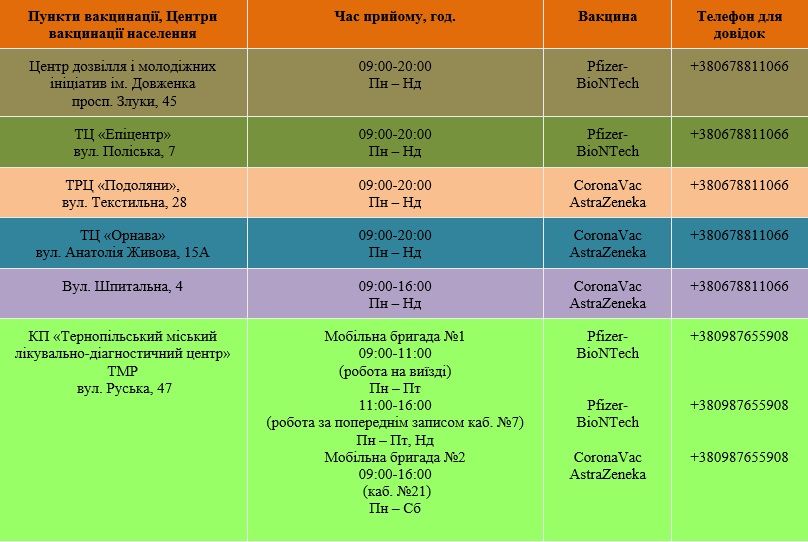 Два додаткових тимчасових пункти щеплень розгорнуто також на залізничному вокзалі та центральному автовокзалі Тернополя, де імунізацію можна пройти вакцинами AstraZeneca, CoronaVac та Pfizer-BioNTech. Графік роботи – з 10:00 до 16:00 год.