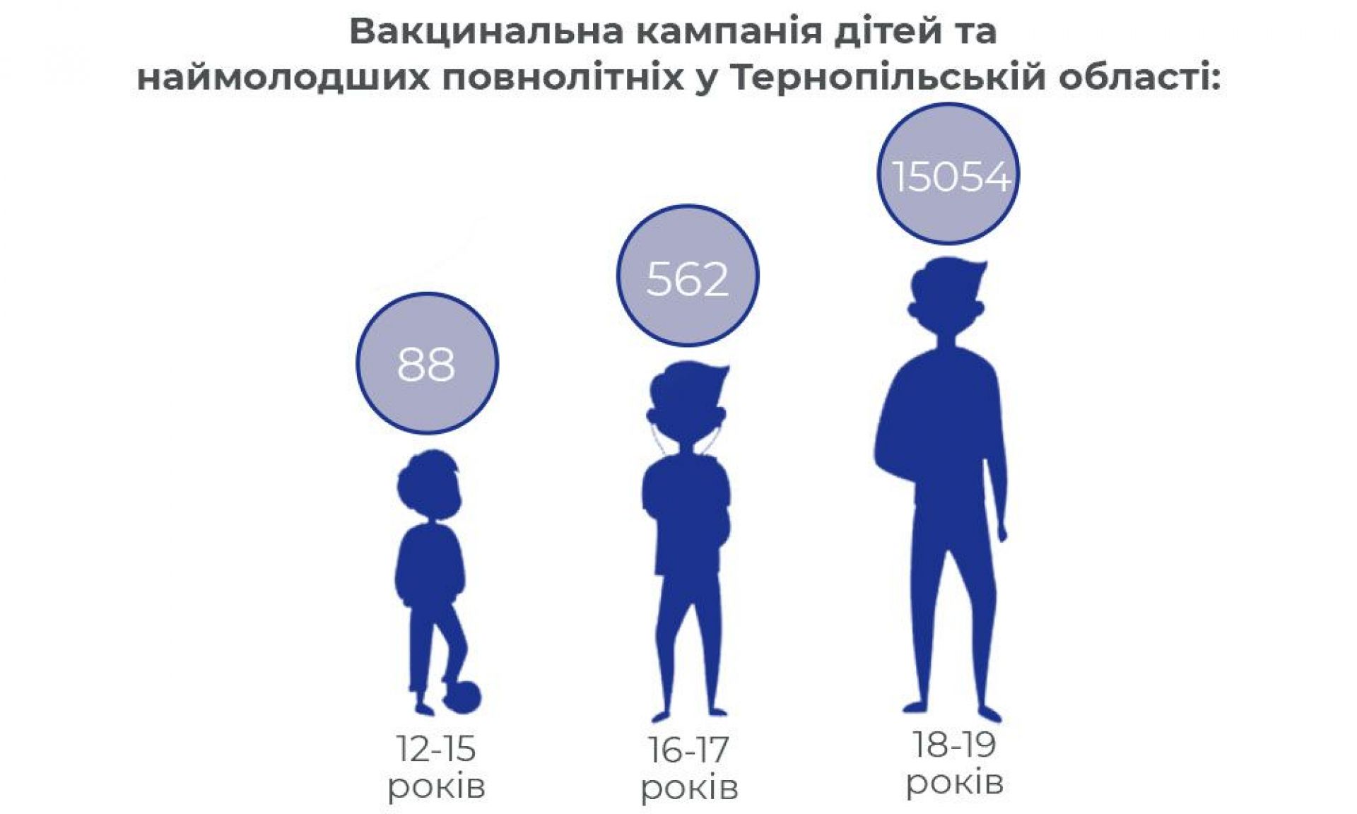 Станом на 5 листопада, у Тернопільській області вакцинували 88 дітей, віком від 12 до 15 років. Більший показник вакцинації старших дітей: щепились від коронавірусу загалом 652 дитини, віком 16-17 років. Наймолодші повнолітні області, віком 18-19 років, найактивніші в цьому плані. Щеплених — 15 054 осіб.