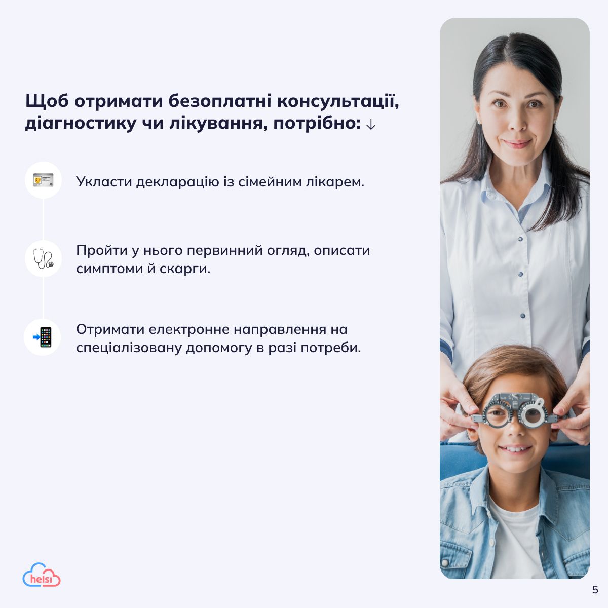 Щоб отримувати безоплатні консультації, діагностику та лікування, потрібно укласти декларацію із сімейним лікарем. Для цього необхідно знайти фахівця через застосунок «Helsi» та записатися до нього на прийом. Під час першого візиту — підписати декларацію з лікарем, розповісти про свої симптоми й скарги. У разі потреби він скерує пацієнта на додаткові обстеження або на консультацію до офтальмолога й видасть направлення.