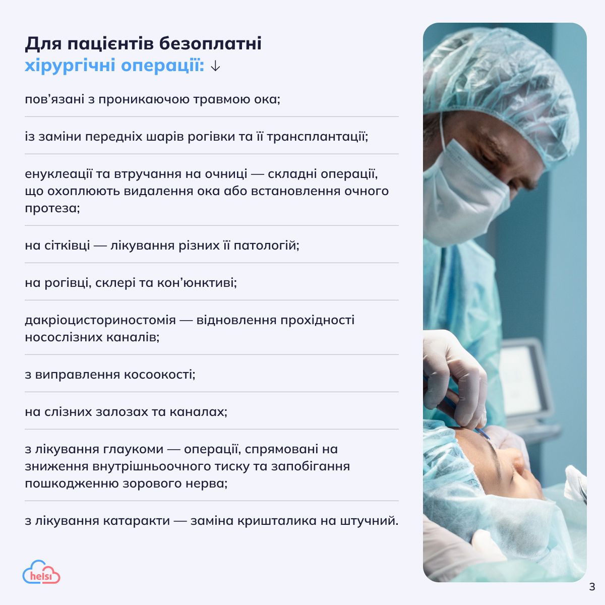 Хірургічні операції безоплатні у всіх медзакладах України, які мають відповідний договір з НСЗУ, незалежно від місця реєстрації пацієнта. Для цього пацієнту потрібно мати медичний висновок щодо необхідності втручання та направлення лікаря.