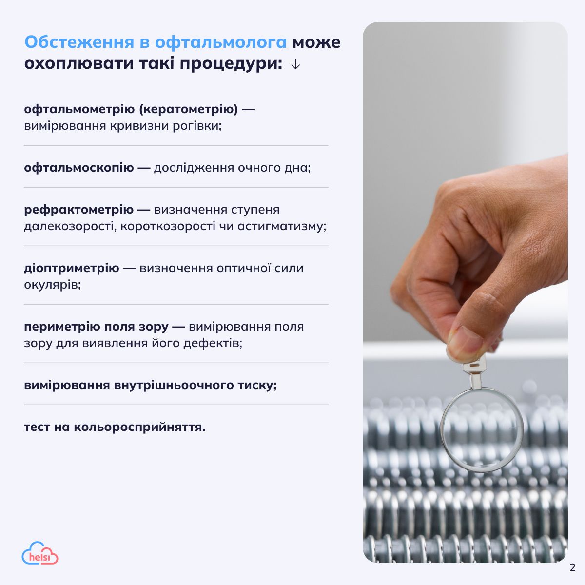 Офтальмолог проводить докладнішу діагностику й дає поради щодо профілактики захворювань очей відповідно до віку людини. Після обстежень офтальмолог складе план лікування, допоможе підібрати потрібні окуляри чи лінзи або скерує на операцію. Усе це — теж безоплатно.