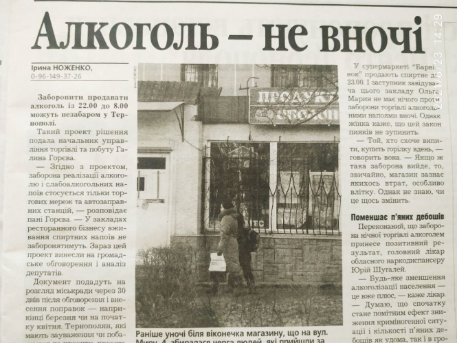 Заборона на продаж алкогольних та слабоалкогольних напоїв у Тернополі діє ще з 8 квітня 2011 року, відповідно до рішення сесії Тернопільської міської ради. Отож, у місті не можна продавати пиво (крім безалкогольного), слабоалкогольних та алкогольних напоїв у торговельній мережі міста, за винятком закладів ресторанного господарства, з 22.00 години вечора до 8.00 години ранку.