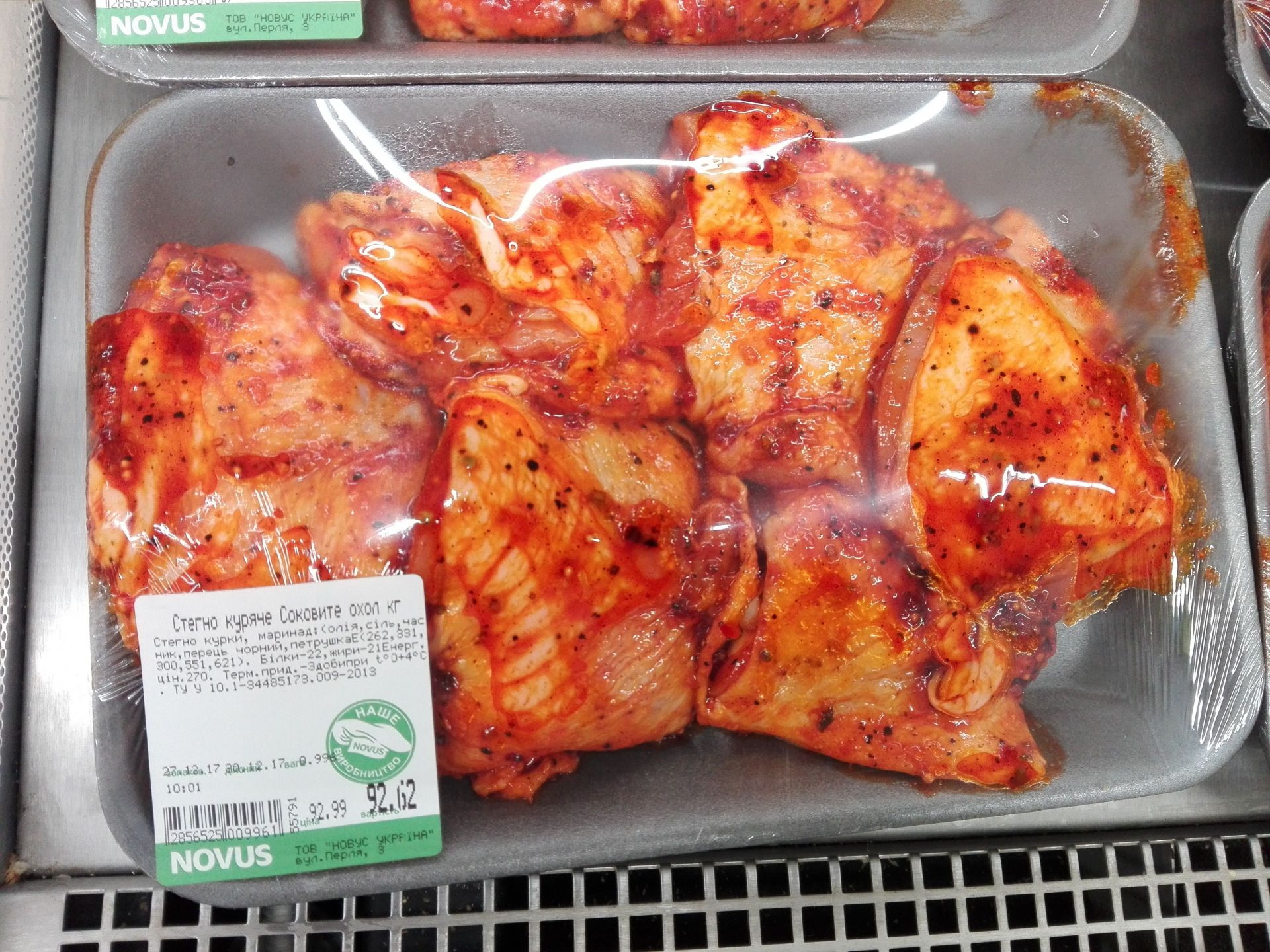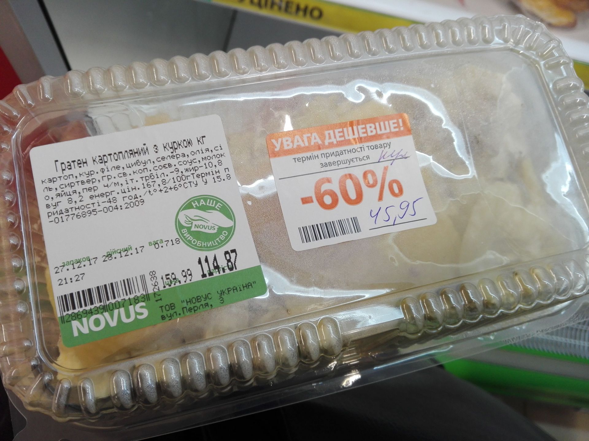 Наступний маркет - Novus. У цьому магазині також було багато молочки, термін придатності якої добігав кінця. Така ж ситуація і з замаринованим м’ясом. Ще в магазині є полиці, на які складають уцінені товари. Серед них є і готові страви магазину, і різні м’ясні продукти та хліб.