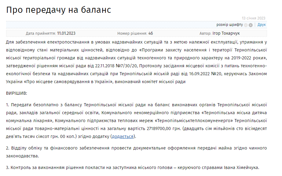 24 генератори були передані згідно з рішенням виконавчого комітету від 11 січня 2023 року №46 «Про передачу на баланс», аби забезпечити роботу «пунктів обігріву» у закладах освіти. Тоді пристрої купили не лише школам і садочкам, але й виконавчим органам Тернопільської міськради, міській дитячій лікарні та «Тернопільміськтеплокомуненерго». 24 генератори для шкіл та дитсадків обійшлись у 13 мільйонів 800 тисяч 600 грн.